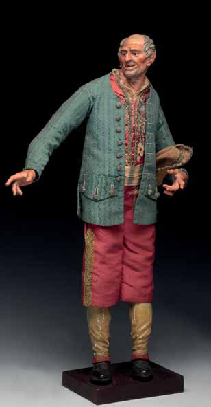 Contadino in abiti da festa, di mezza età con giacca in seta operata verde, pantaloni e corpetto rosso, fusciacca in vita di seta avorio a fasce verdi, nel vecchio catalogo così descritto: “Uomo che conduce il cavallo sul quale è la giovane contadina, mirante a sinistra, sorridente, di Giuseppe Gori, (prov. collezione Scuotto)” Altezza cm 36; fine secolo XVIII Accessori: cappello