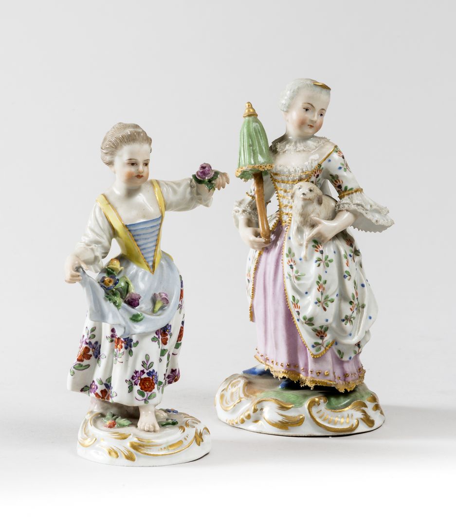 PORCELLANA META' XIX SECOLO Donna con cagnolino e ombrellino Marchio sotto la...