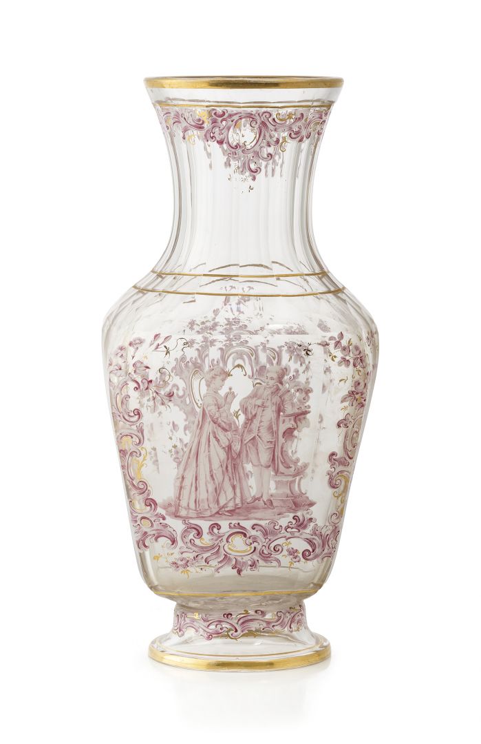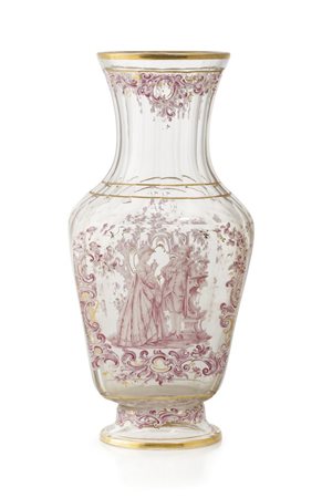 GRANDE VASO IN VETRO Con corpo sfaccettato e dipinto a smalto rosa, lilla e...