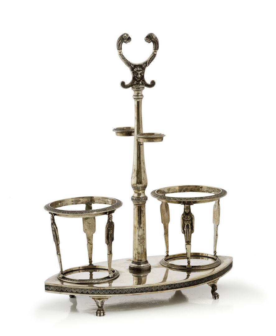 OLIERA IN ARGENTO Base ovale con reggi bottiglie a giorno ognuno con tre...