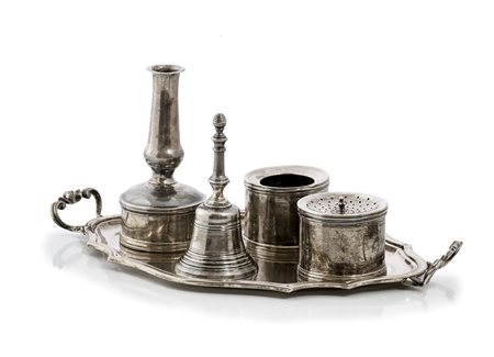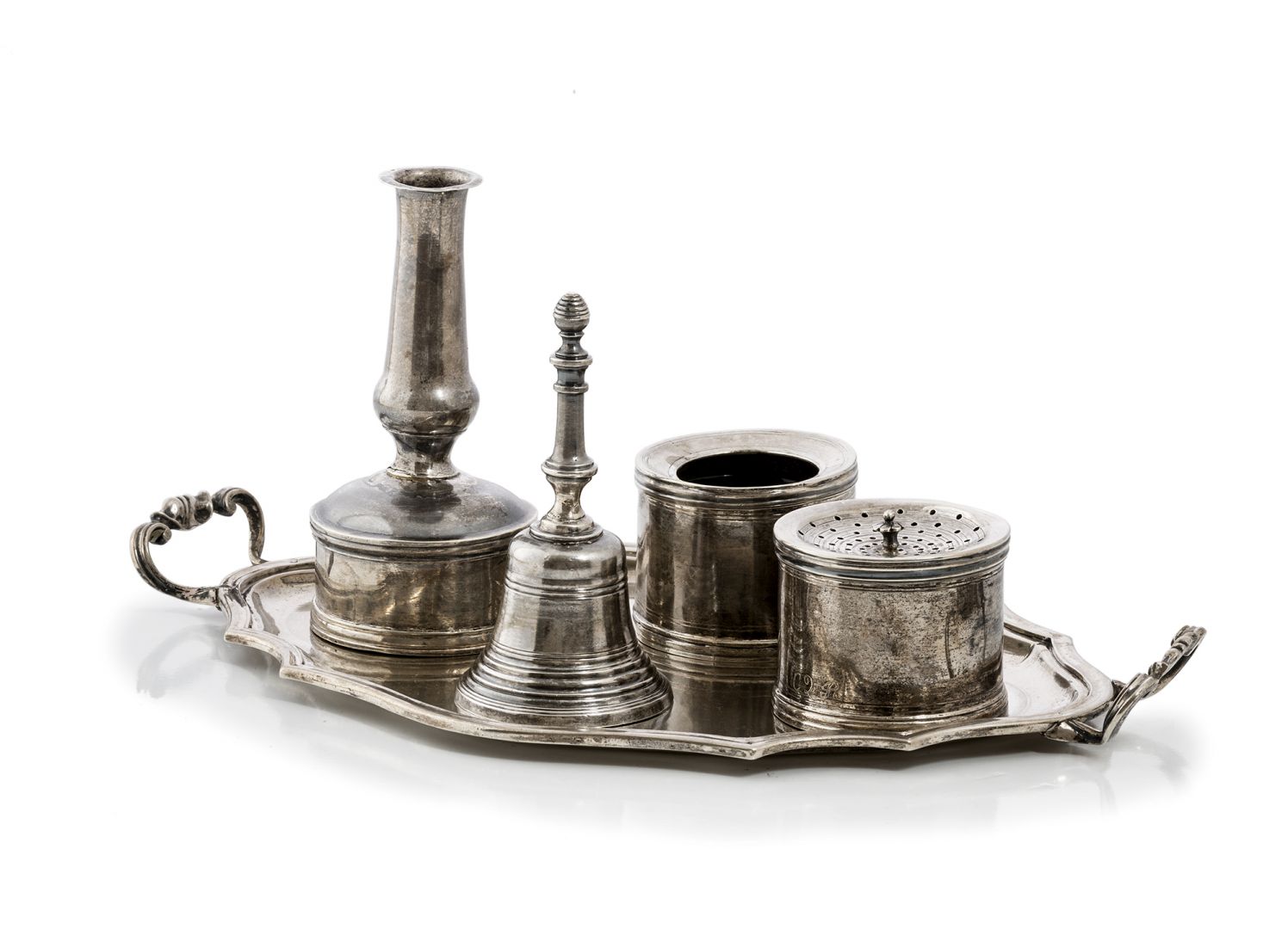 Comprendente spargi sabbia, porta penna porta inchiostro, campanello e vassoio.