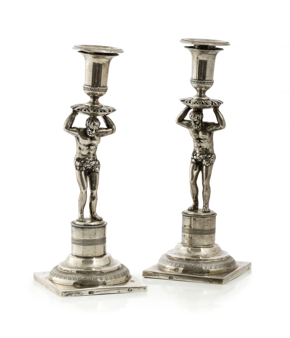 RARA COPPIA DI CANDELIERI NEOCLASSICI IN ARGENTO Cesellati con figura...