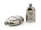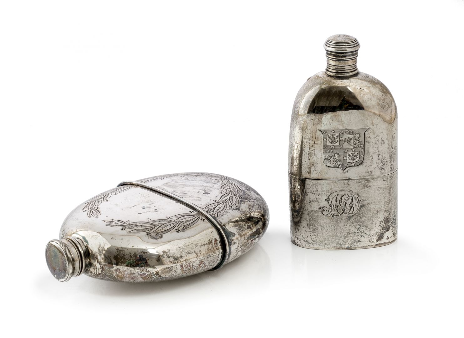 DUE FIASCHE IN ARGENTO una di forma ovale con disegno di inciso l'altra a...