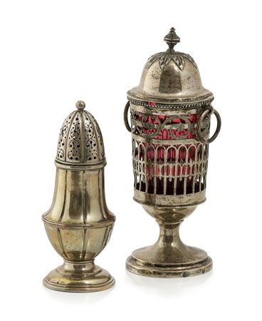 SALSIERA E SPARGI ZUCCHERO IN ARGENTO a coppa cilindrica con corpo traforato...