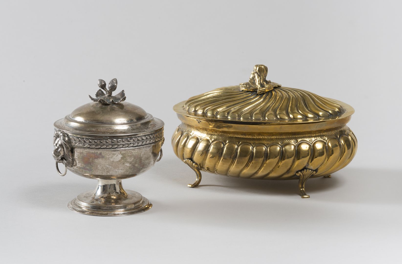 SCATOLA IN ARGENTO DORATO E COPPETTA IN ARGENTO Scatola di forma ovale, corpo...