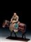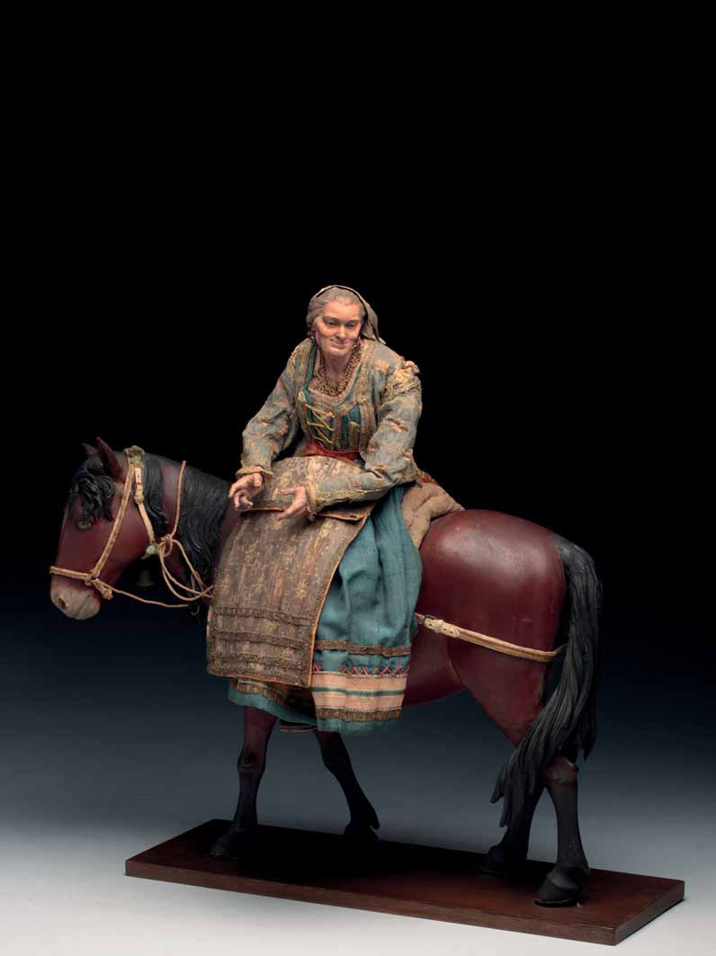 Vecchia contadina mirante a destra naso “ngriccato”, sorridente, capelli grigi raggruppati sulla nuca, di Giuseppe Sammartino, (prov. collezione Giusso) seduta su Cavallo Rustico baio scuro al passo, in legno, di Nicola Vassallo (prov. collezione Catello). La contadina con bella vestitura da festa indossa una gonna in seta azzurro carico, un corpetto in seta operata e un grembiule in seta damascata gallonato. Il cavallo è bardato in cuoio ed è sellato con basto alla contadina. La donna altezza cm 35; il cavallo altezza cm 31; fine secolo XVIII Accessori: orecchini e collana a catena in oro (?) a due giri