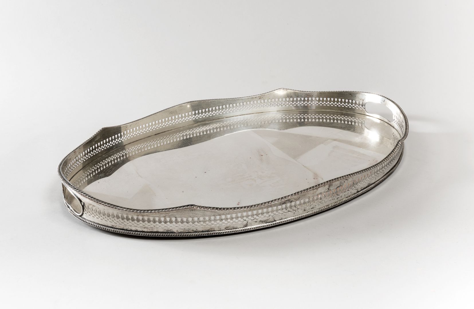 GRANDE VASSOIO IN SHEFFIELD di forma ovale con bordo a ringhiera cm 4,5 x 60...
