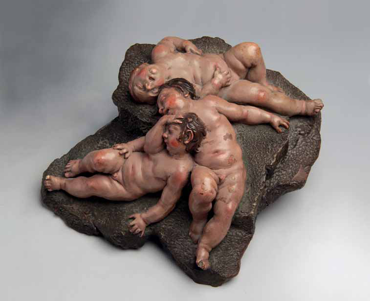Gruppo di tre nudini addormentati, due maschietti e una femminuccia, mirabilmente modellati in artistico intreccio, uno dei maschietti a bocca chiusa poggia il capo sul petto dell’altro che dorme a bocca aperta e tiene il braccio destro piegato con la mano sulla testa che gli posa sul petto. La piccolina ha la testina reclinata a destra con la boccuccia aperta, di Salvatore di Franco (prov. Oderisio Menna) cm 17x15; fine secolo XVIII