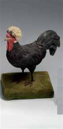 Gallo nero con tuppo bianco, di Francesco Gallo, dal bellissimo piumaggio, montato su di una piccola base in legno. Altezza cm 11,5; fine secolo XVIII
