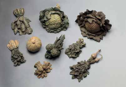 Lotto di nove nature morte di verdure modellate in terracotta, fine secolo XVIII e inizio secolo XIX, comprendente: a. Mazzo di sedani posate su un fianco, capolavoro di Giuseppe De Luca b. Grossa zucca costoluta, tondeggiante di Farenariello (prov. collezione Scuotto) c. Mazzo di rape posato su un piano, foglie movimentate, capolavoro di Francesco Gallo (prov. collezione Scuotto) d. Cavolo cappuccio, foglie chiare capolavoro di Giuseppe De Luca (prov. collezione Scuotto) e. Cavolo cappuccio, foglie scure, capolavoro di Giuseppe De Luca (provenienza collezione Scuotto) f. Tre fasci di verdure diverse g. Fascio con due carciofi