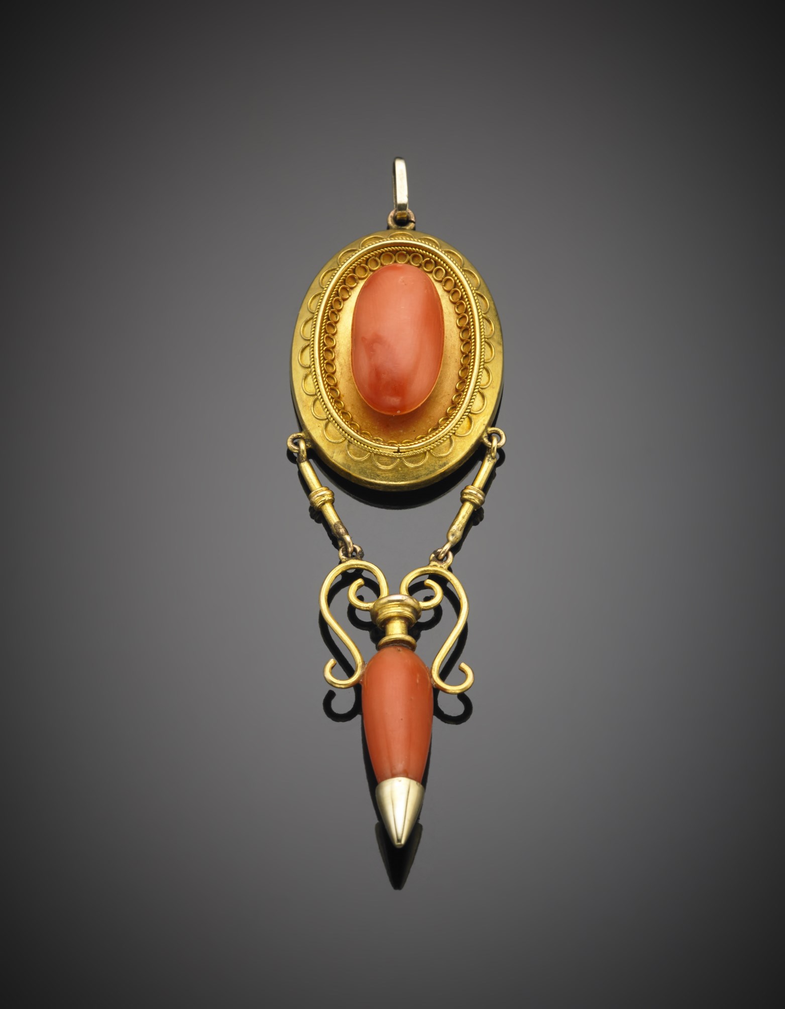 Pendente in oro giallo 585/1000, con lavorazione a ricordare il periodo etrusco, in centro un corallo ovale a tutto tondo, con pendente una goccia sempre in corallo, difetto sulla punta, g. 6,40, lungh. 6,50 A low carat gold pendant centered by a coral