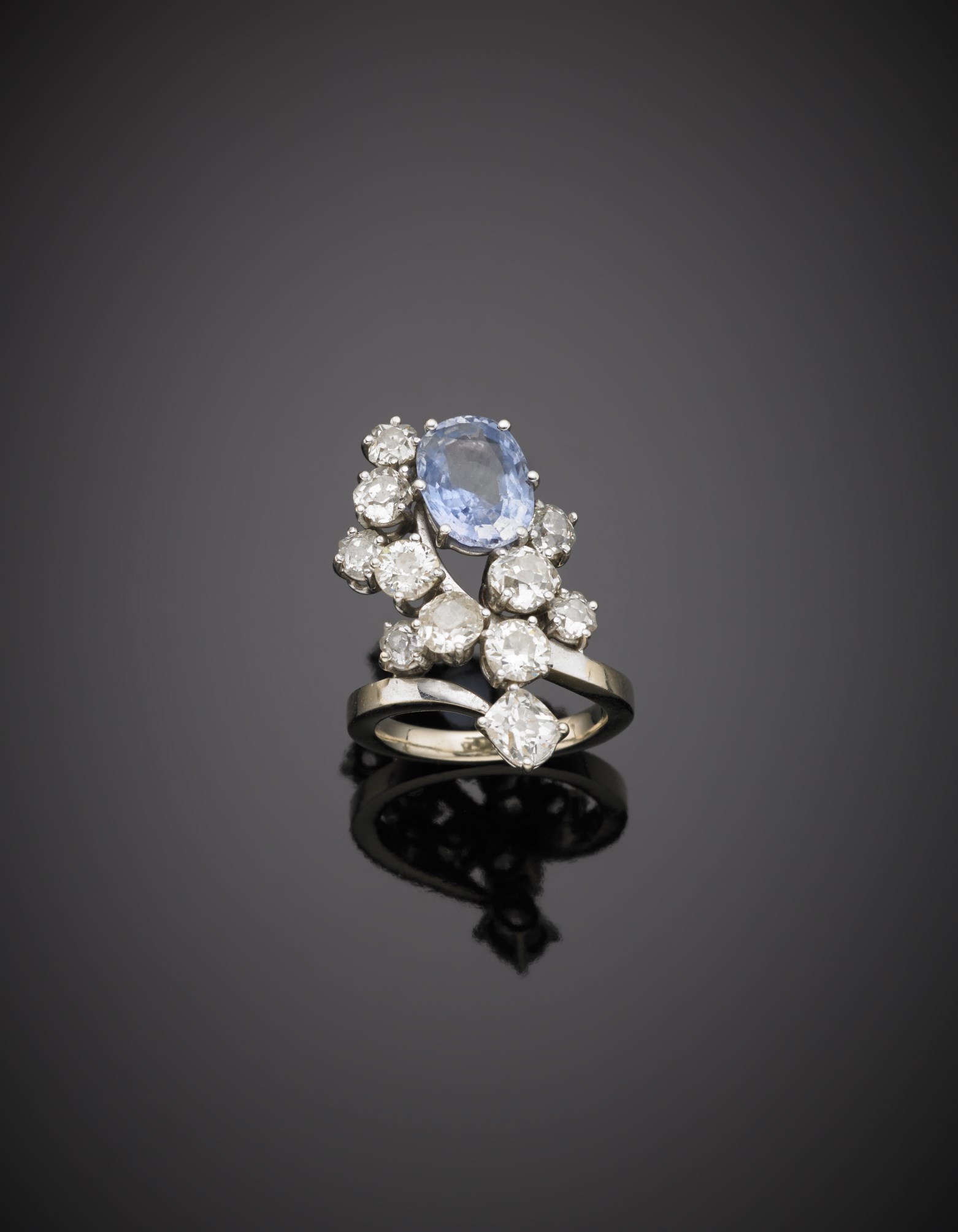 Lotto 50 | Anello in oro bianco con zaffiro ovale e diamanti rotondi, g. 8,30 misura...