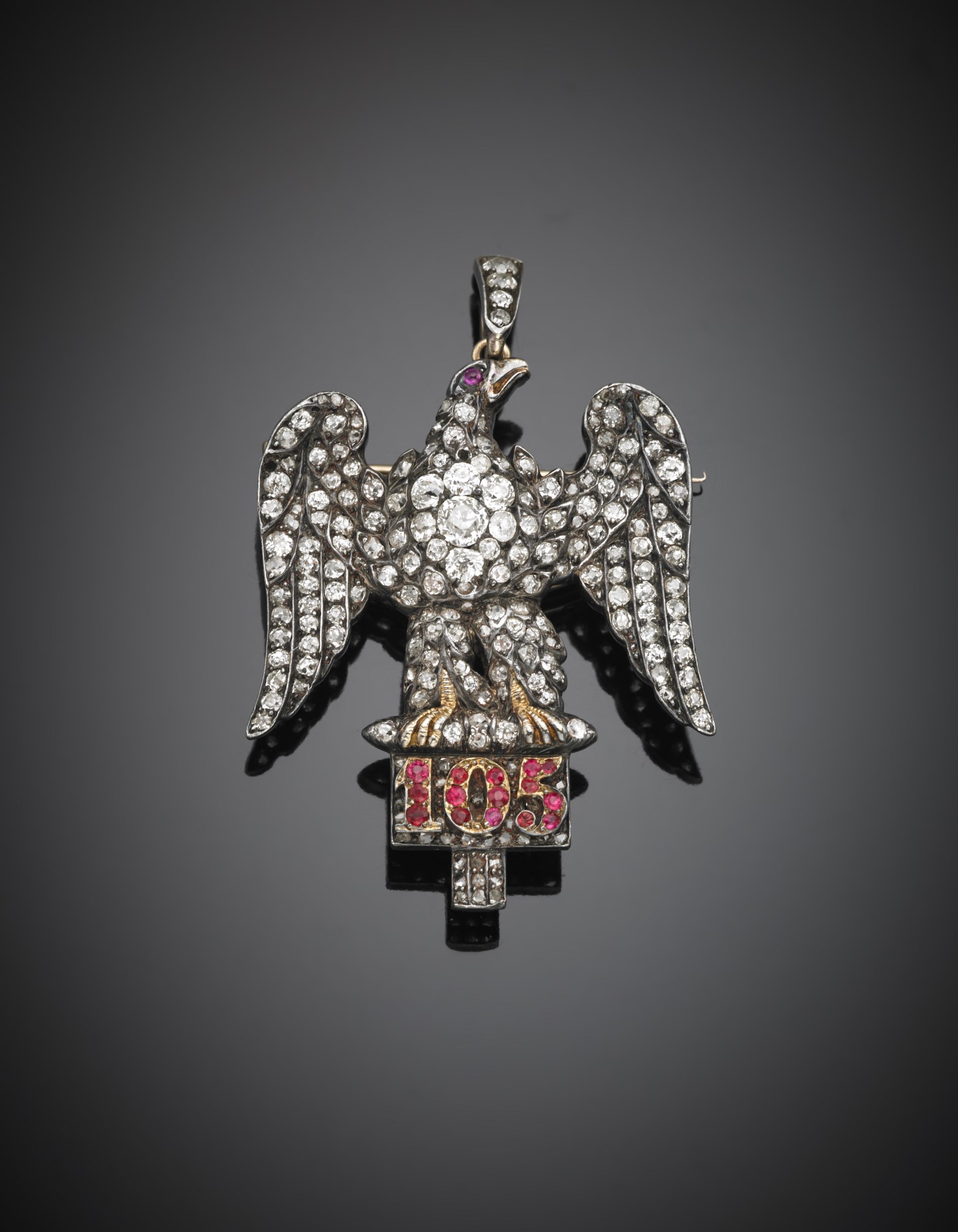 Pendente/spilla inglese in oro giallo e argento con diamanti e rubini raffigurante l'aquila del 105ᄚ Reggimento francese di Napoleone sconfitti e catturati nella battagla di Waterloo dai Royal Dragoons del Capitano Clark del 1815 g. 19,70, lumgh. cm 5,5 Yellow gold and silver ruby an diamond pendant/brooch with the eagle of the 105th Napoleon French Regiment