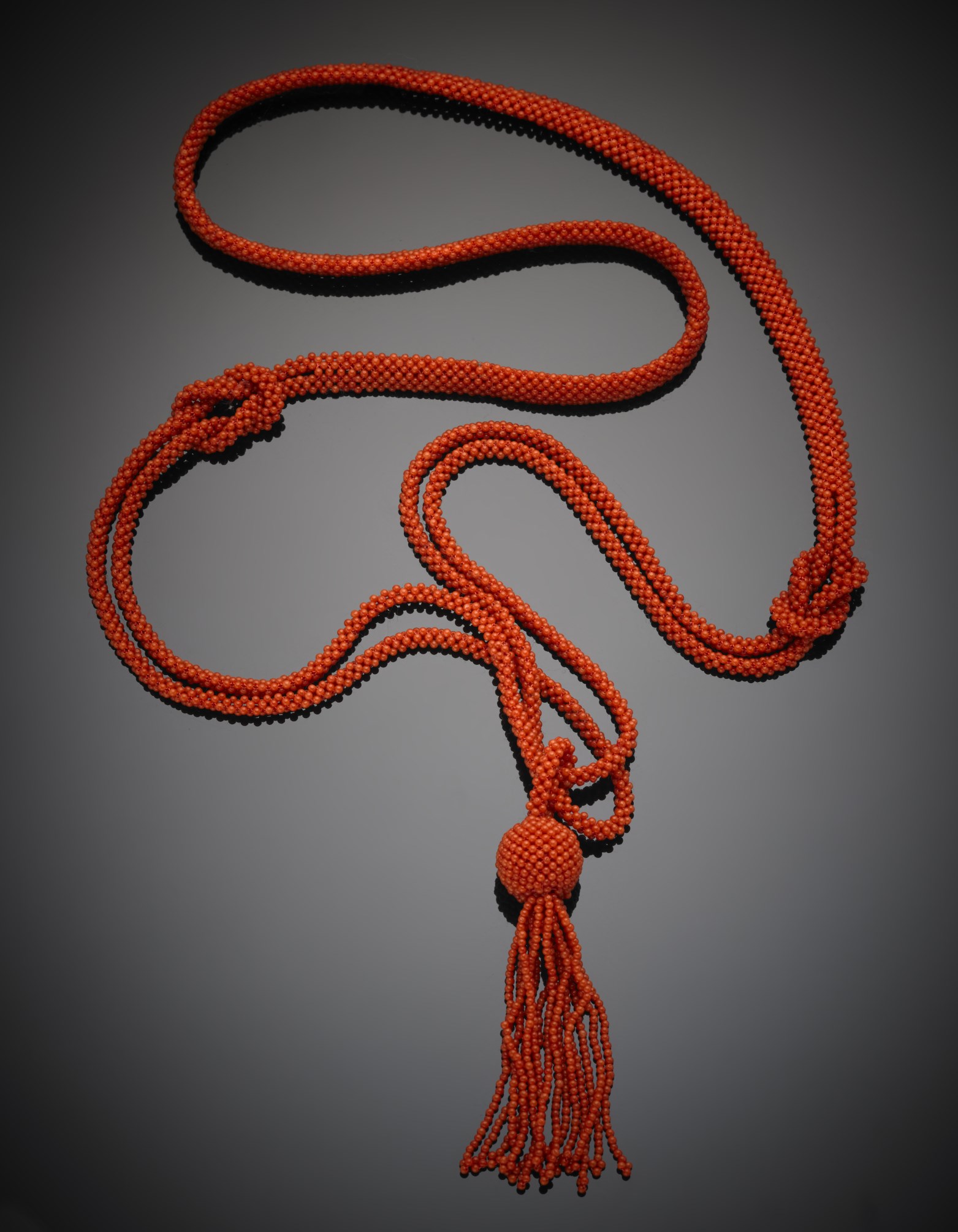 Soutoir di piccole boules di corallo rosso aranciato finito con un pendente boule e nappa g. 55,10 A red/orange coral sautoir ending in a boule