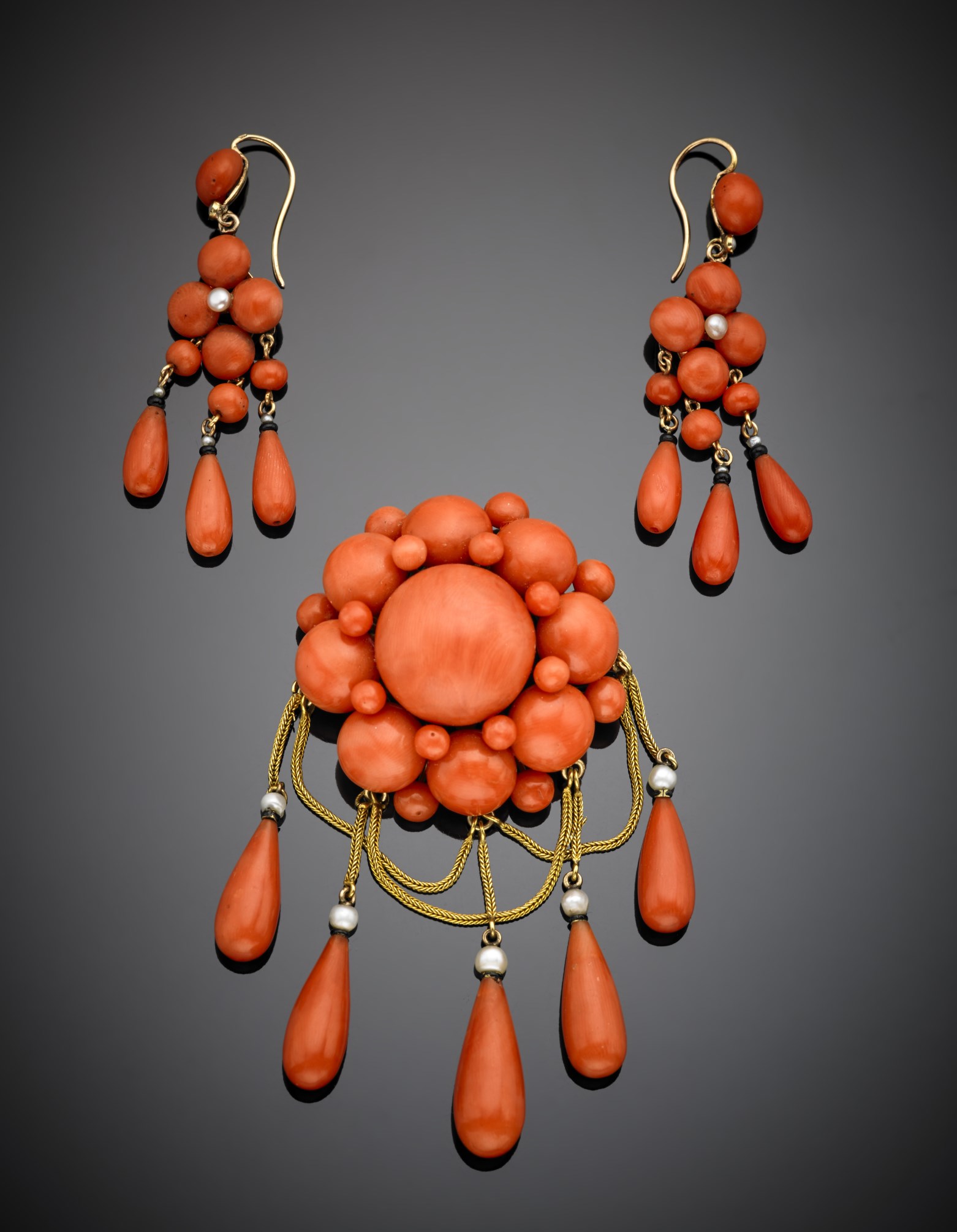 Demi-parure, broche ed orecchini pendenti in oro giallo con corallo...
