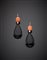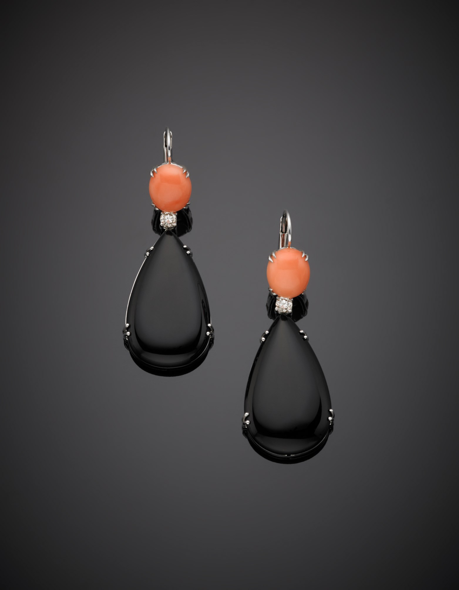 Orecchini pendenti in oro bianco con due coralli arancioni ovali cabochon, due diamanti rotondi e due gocce cabochon di onice g. 14,30, lungh. cm 5,30 circa White gold orange coral, diamond and onyx ear pendants