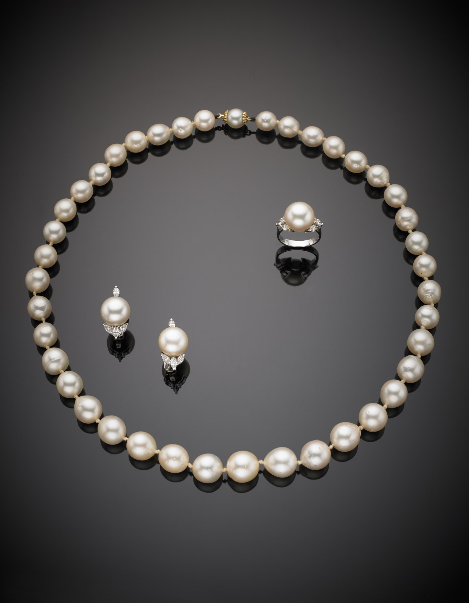 Demi-parure composta da collana, orecchini ed anello con perle coltivate bianche south sea, la chiusura rifinita in oro giallo ed il resto in oro bianco con diamanti navette. La collana con perle da mm 9 a mm 12 circa, gli orecchini mm 12 circa ed l'anello mm 13 circa. Complessivi g. 110, misura anello 14,54 Diamond and cultured pearl bi-coloured suite of jewellery comprising a pair of earrings and a ring