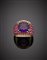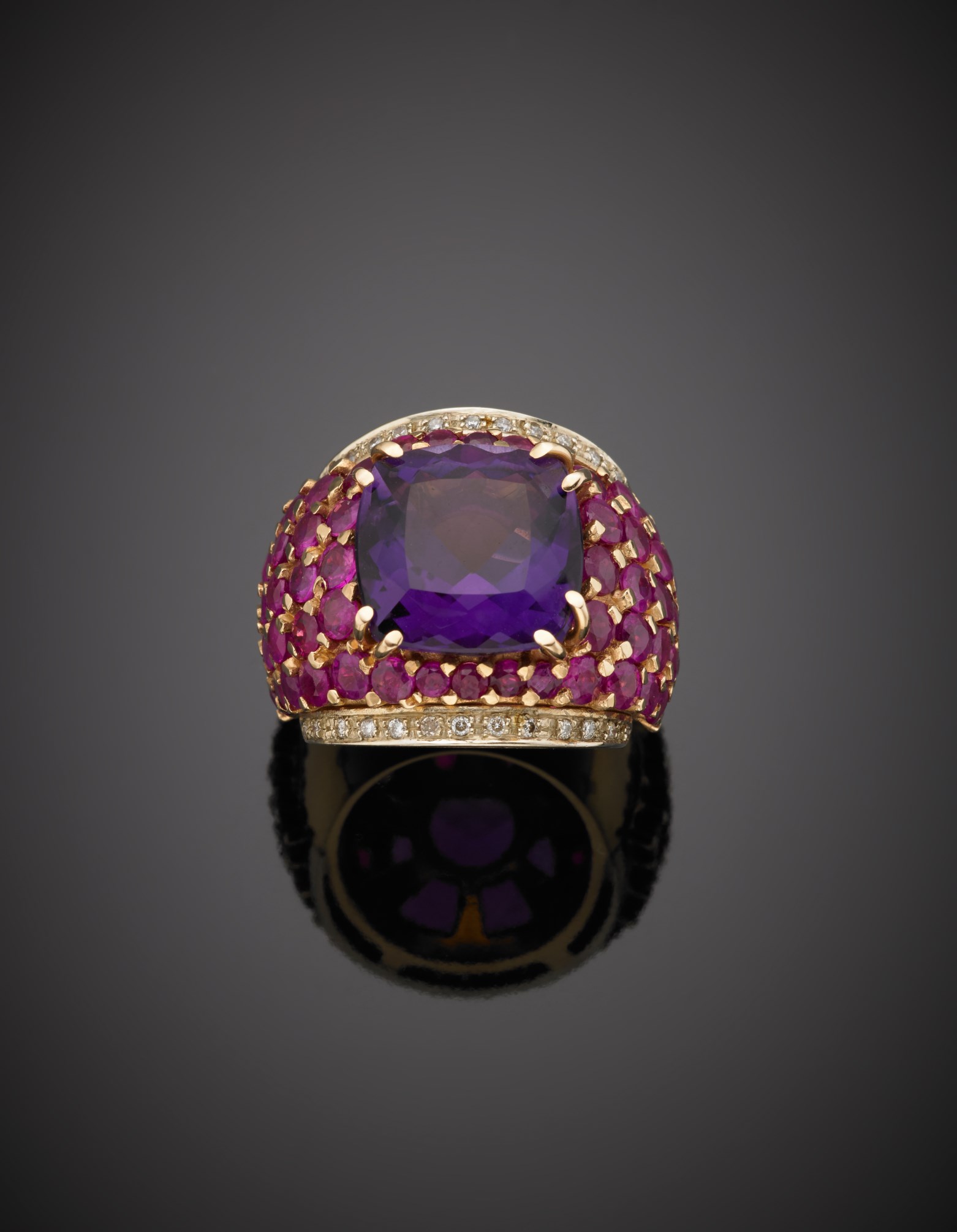 Anello in oro bianco e giallo al centro ametista di forma a cuscino di ct 13,50 circa circondata da un pavè di rubini rotondi per complessivi ct 6,00 circa e due linee di diamanti, g. 29,90, misura 15/55 Bi-coloured gold, amethist , ruby and diamond ring