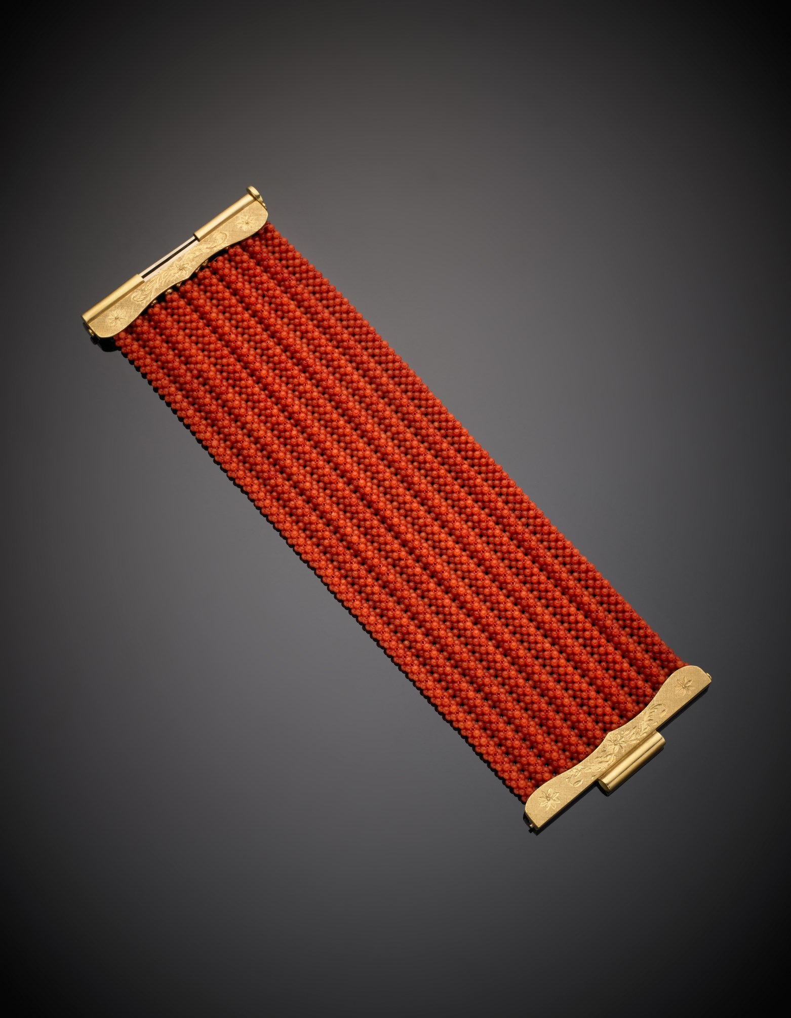 Bracciale in corallo rosso del Mediterraneo lavorato come un tessuto con chiusura in oro giallo satinato ed inciso a lucido, chiusura a baionetta, g. 84,40, lungh. cm 20, h cm 6 circa Mediterranean red coral bracelet with gold clasp