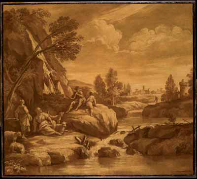 Domenico Pecchio Casaleone 1687 – Verona 1760 Paesaggio con veduta fluviale, pastori e armenti grisaille ad olio su tela, cm 73x81