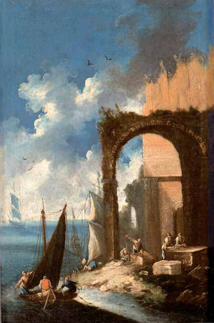 Bartolomeo Pedon Venezia 1665 – 1732 Paesaggio con rovine olio su tela, cm 78x52