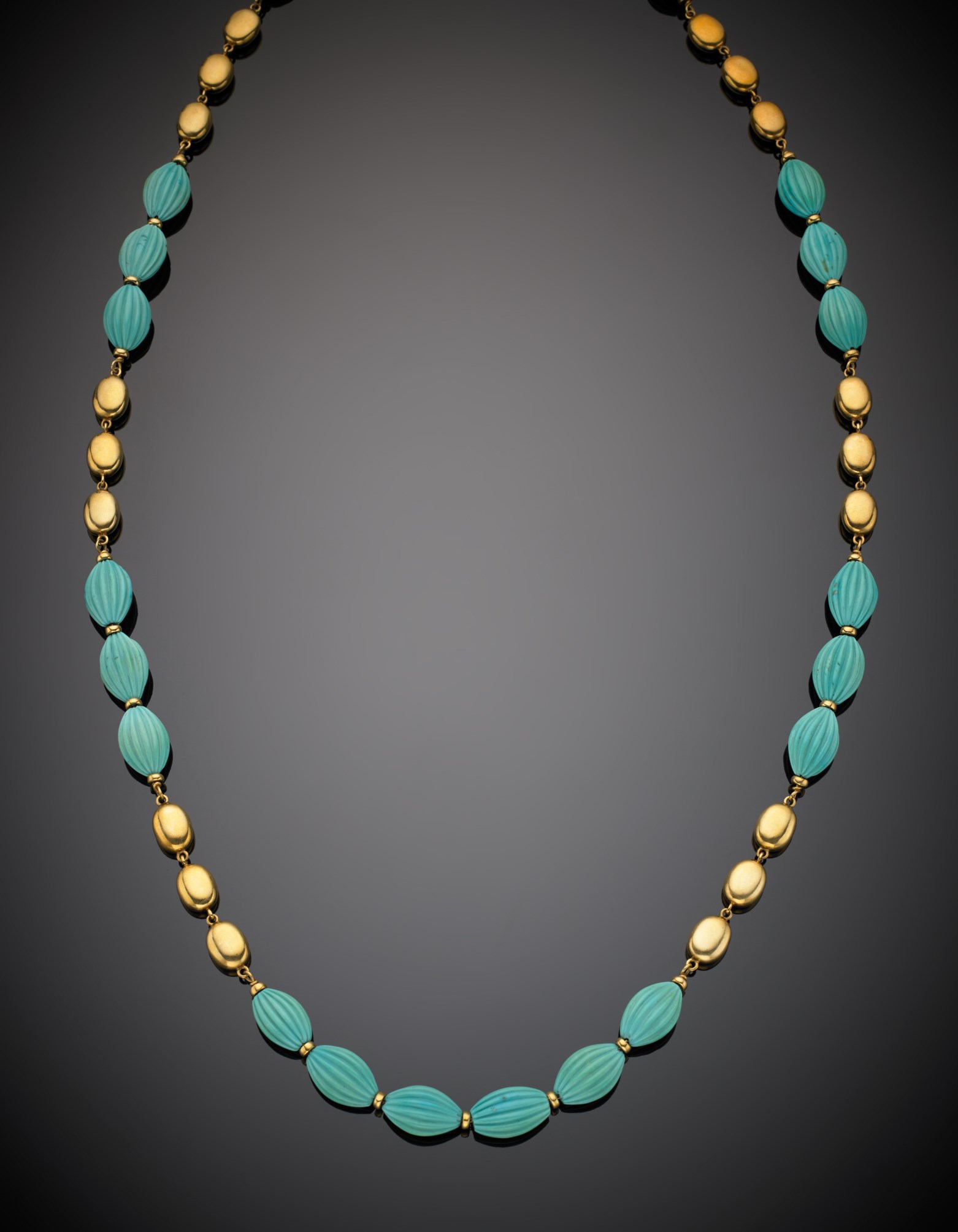 Collana di turchesi a losanga rigata rifinita con delle boules a sasso in oro giallo come la chiusura g. 134,10, lungh. cm 101 Yellow gold and ribbed turqoise bead necklace