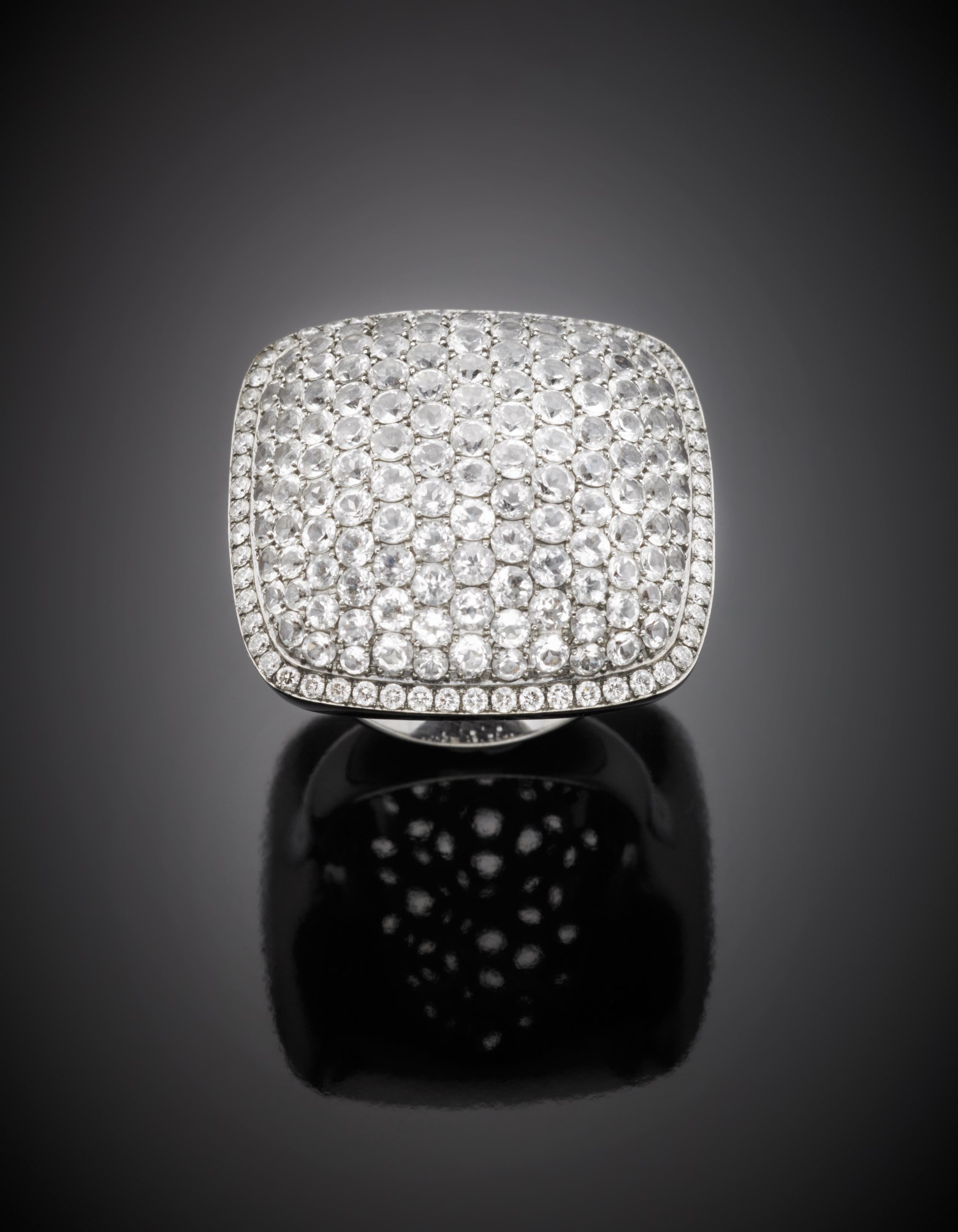 Anello in oro rodiato nero con diamanti rotondi a contornare un pavè di quarzo ialino g. 18,30, misura 14/54 Diamond and quartz rhodium-plated black gold ring