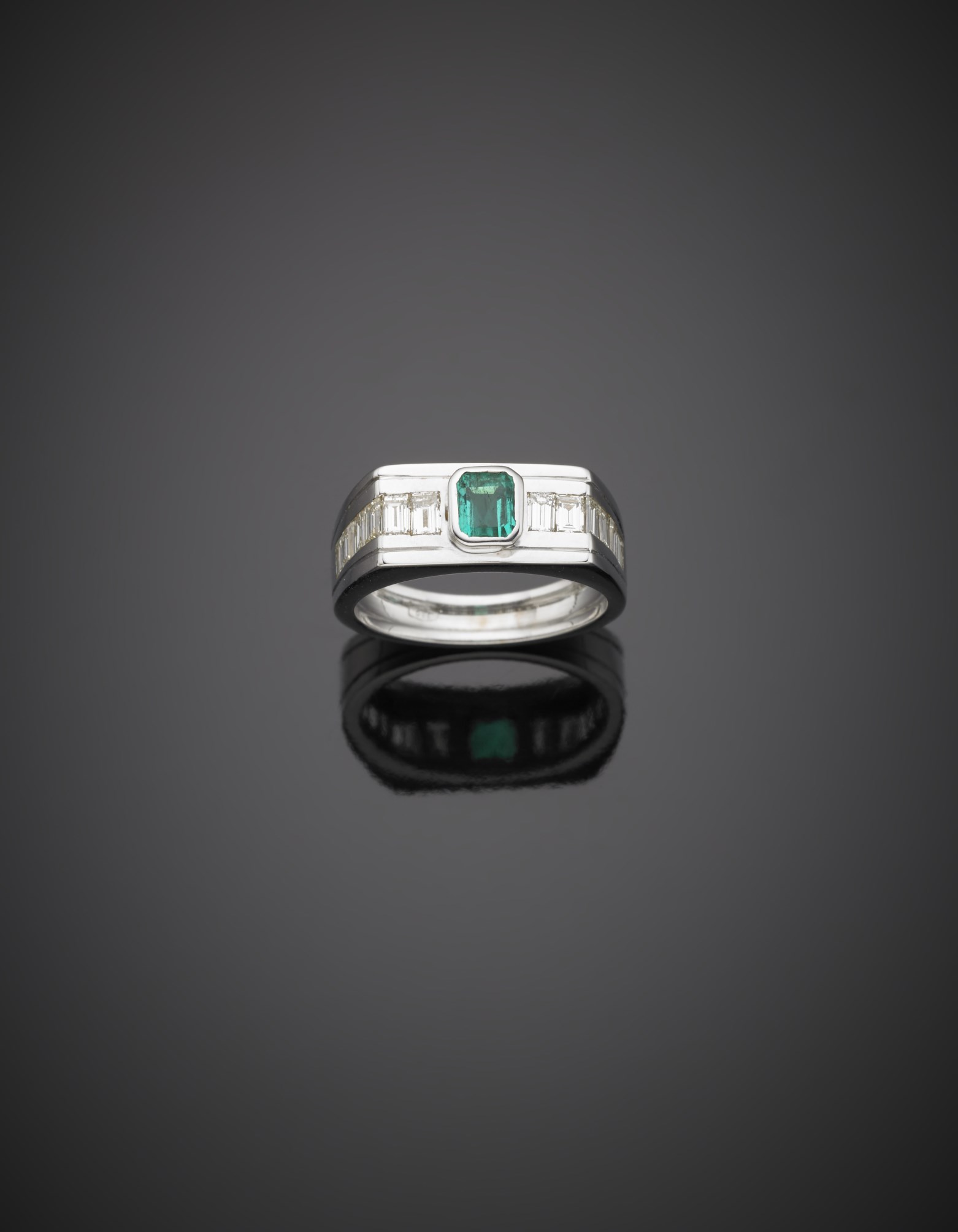 Anello in oro bianco rodiato con diamanti baguette e uno smeraldo ottagonale...