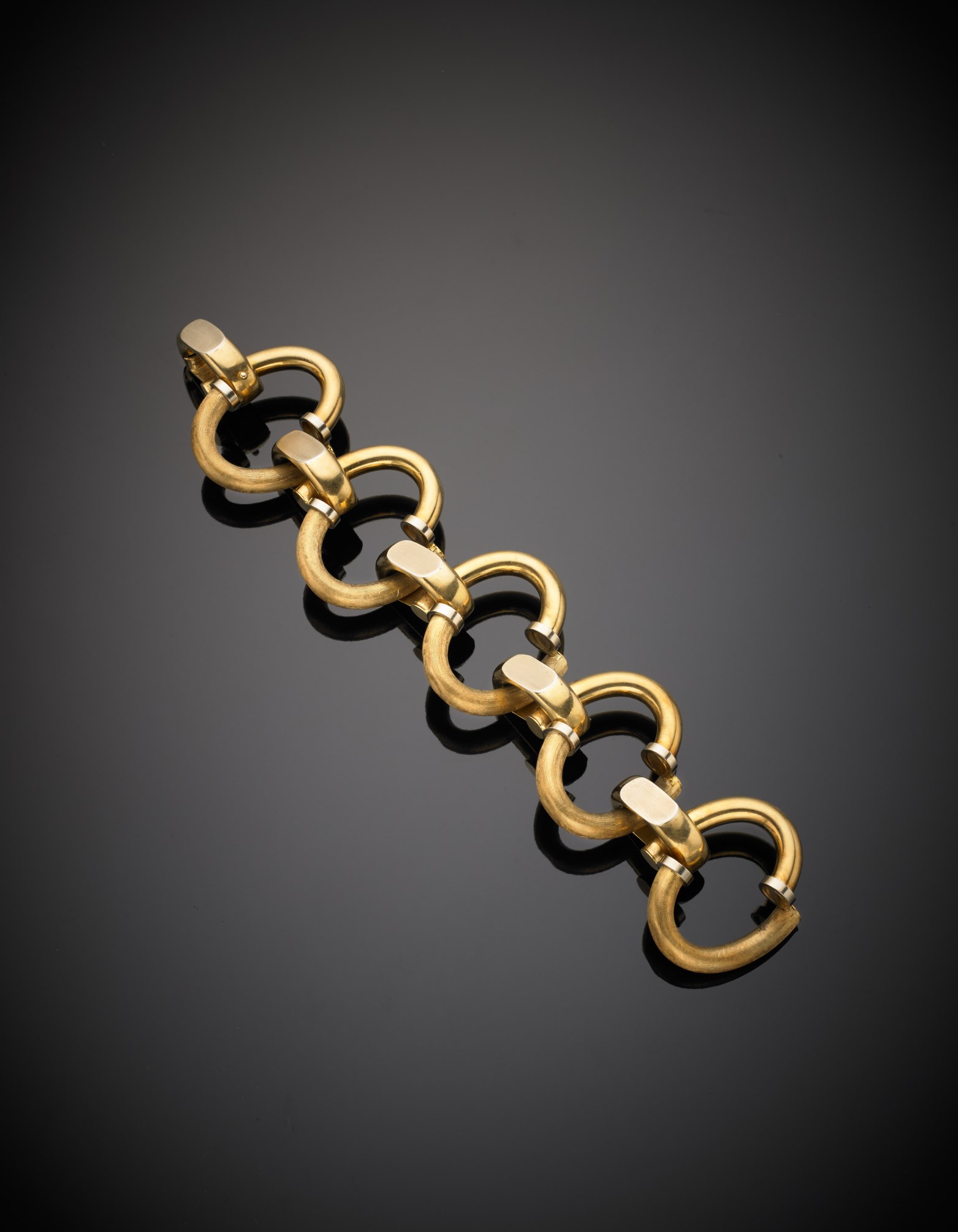 Bracciale in oro giallo e bianco, lucido e satinato con chiusura a scomparsa g. 121,50, lungh. cm 21 circa, altezza cm 4,5 circa (difetti)