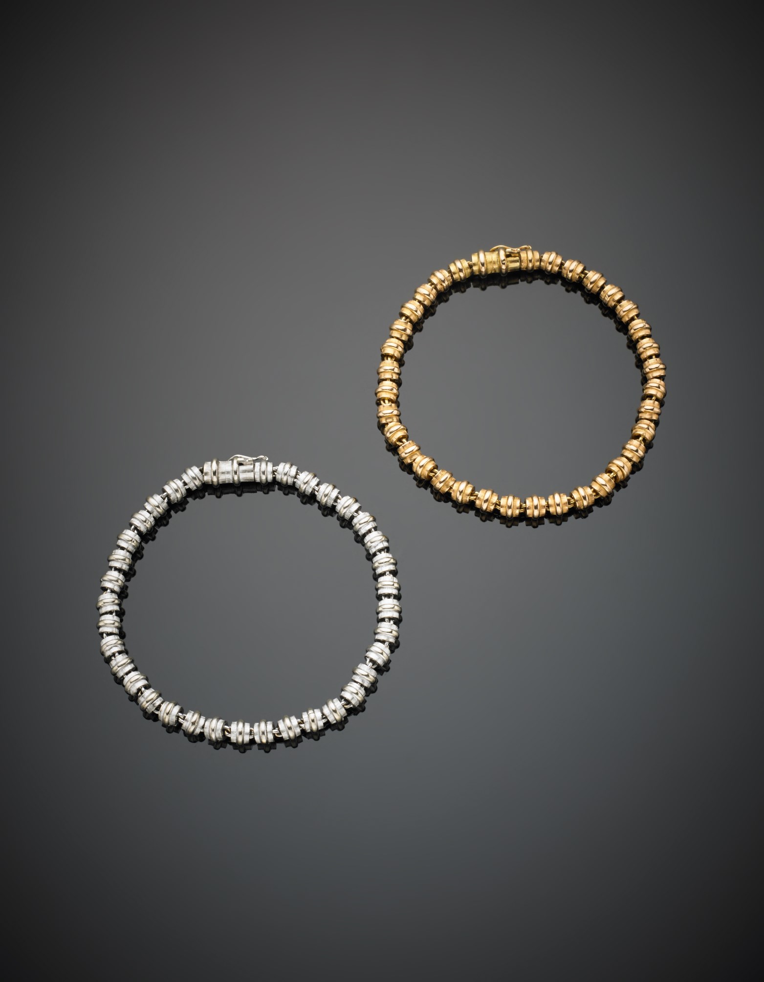 Due bracciali in oro giallo e bianco a barilotti incatenati g. 49,90, lungh. cm 17,50 Two bi-coloured gold bracelets