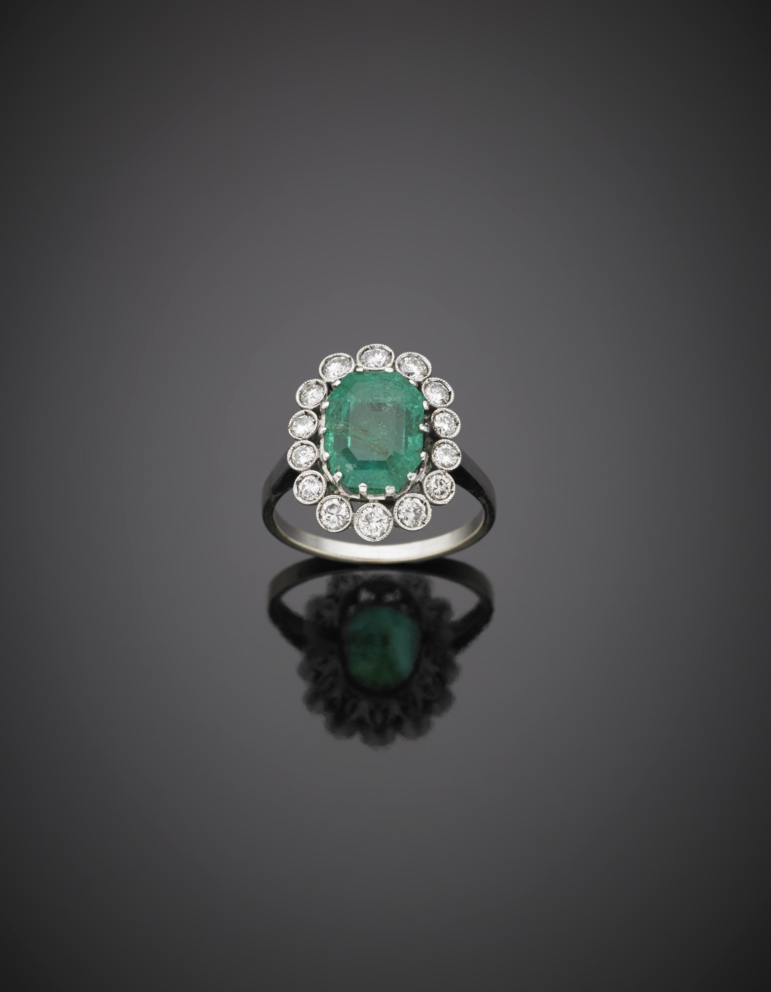 Anello in oro bianco con smeraldo ottagonale di ct.5,00 circa e diamanti rotondi g.5,70 misura 18/58 Accompagnato da analisi gemmologica del CISGEM Milano del 16/09/2016 A white gold emerald and diamond cluster ring Appended CISGEM jewellery certificate
