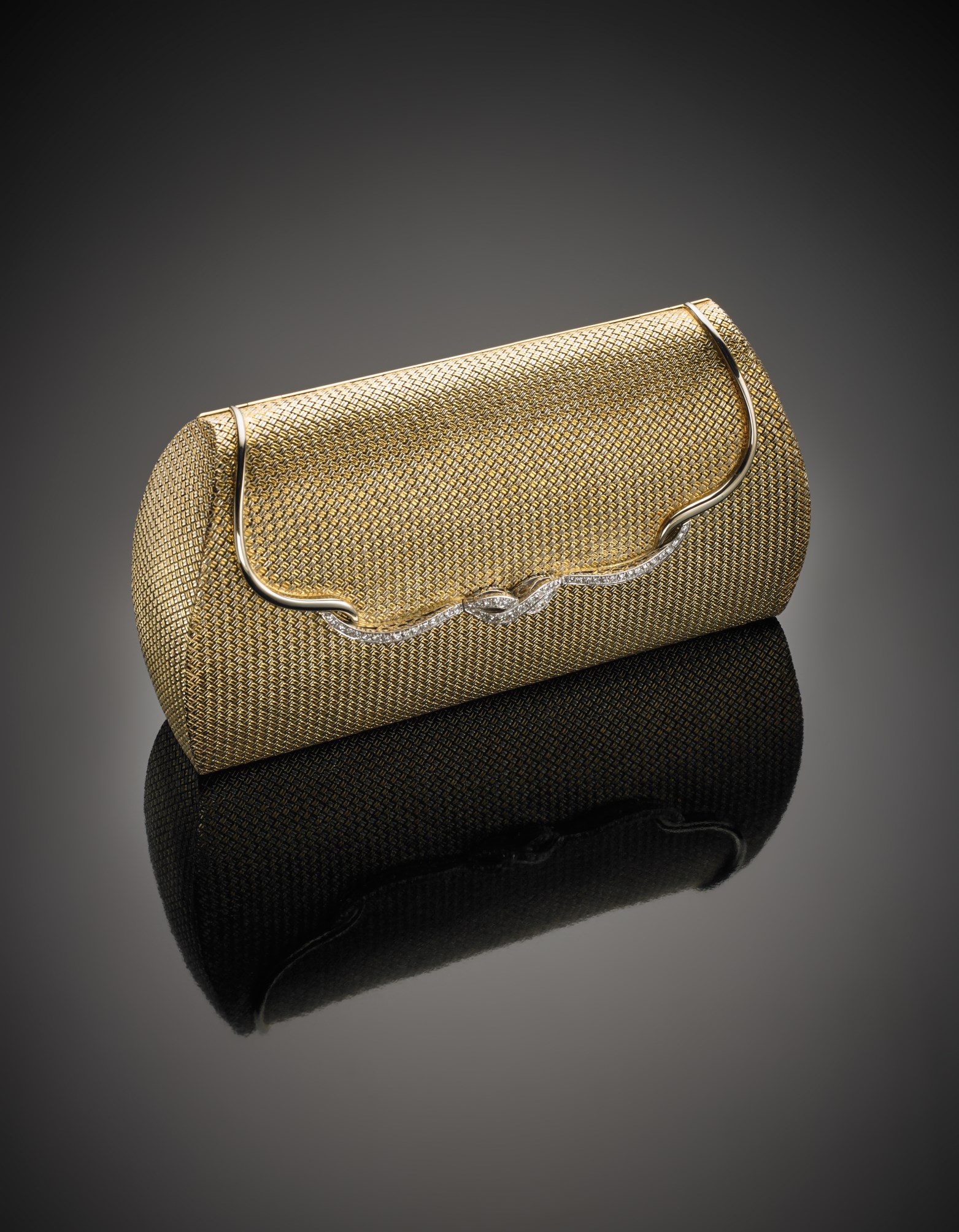 CHIAPPE Borsetta da sera in oro e diamanti sulla chiusura, specchio all'interno, g. 397,40, lungh. cm 17,30 largh. cm 4,20, h cm 9,20. In scatola originale Gold and diamond evening clutch, with original box