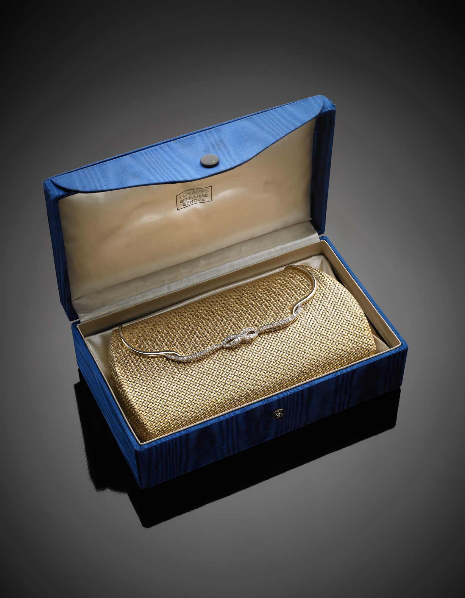 CHIAPPE Borsetta da sera in oro e diamanti sulla chiusura, specchio...