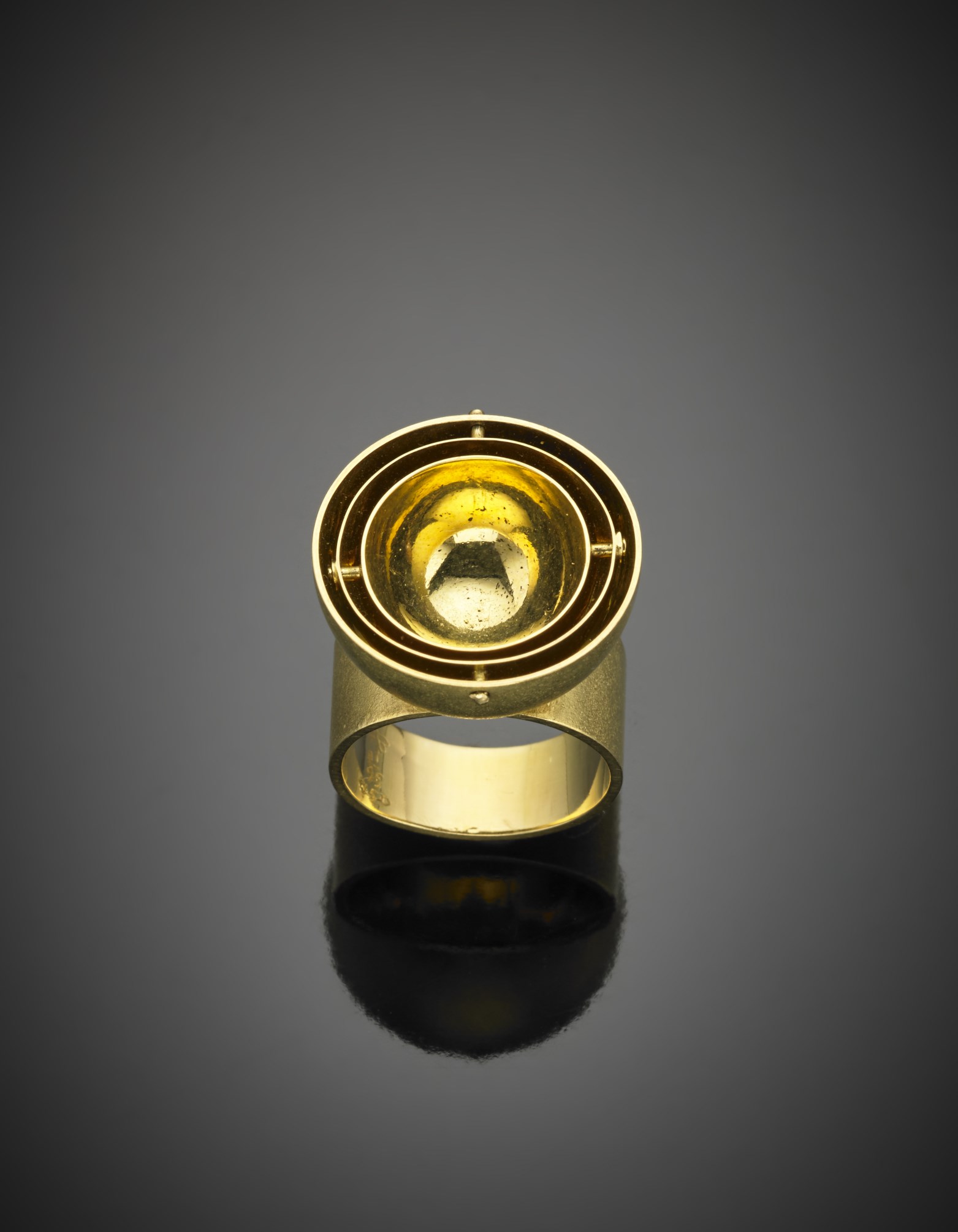 Anello in oro giallo lucido e satinato, con mezze sfere basculanti, g. 15,10,...