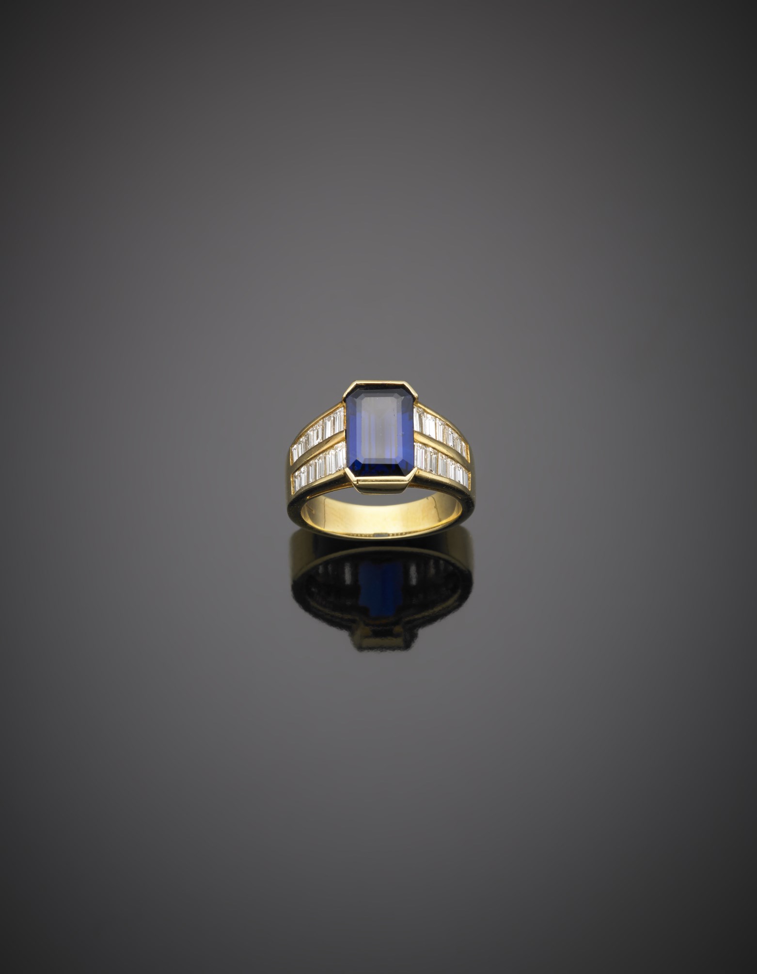 Anello in oro giallo a fascia con zaffiro rettangolare di ct.3,65 e diamanti baguette g.9,00, misura 14/54 Sapphire and diamond gold band ring
