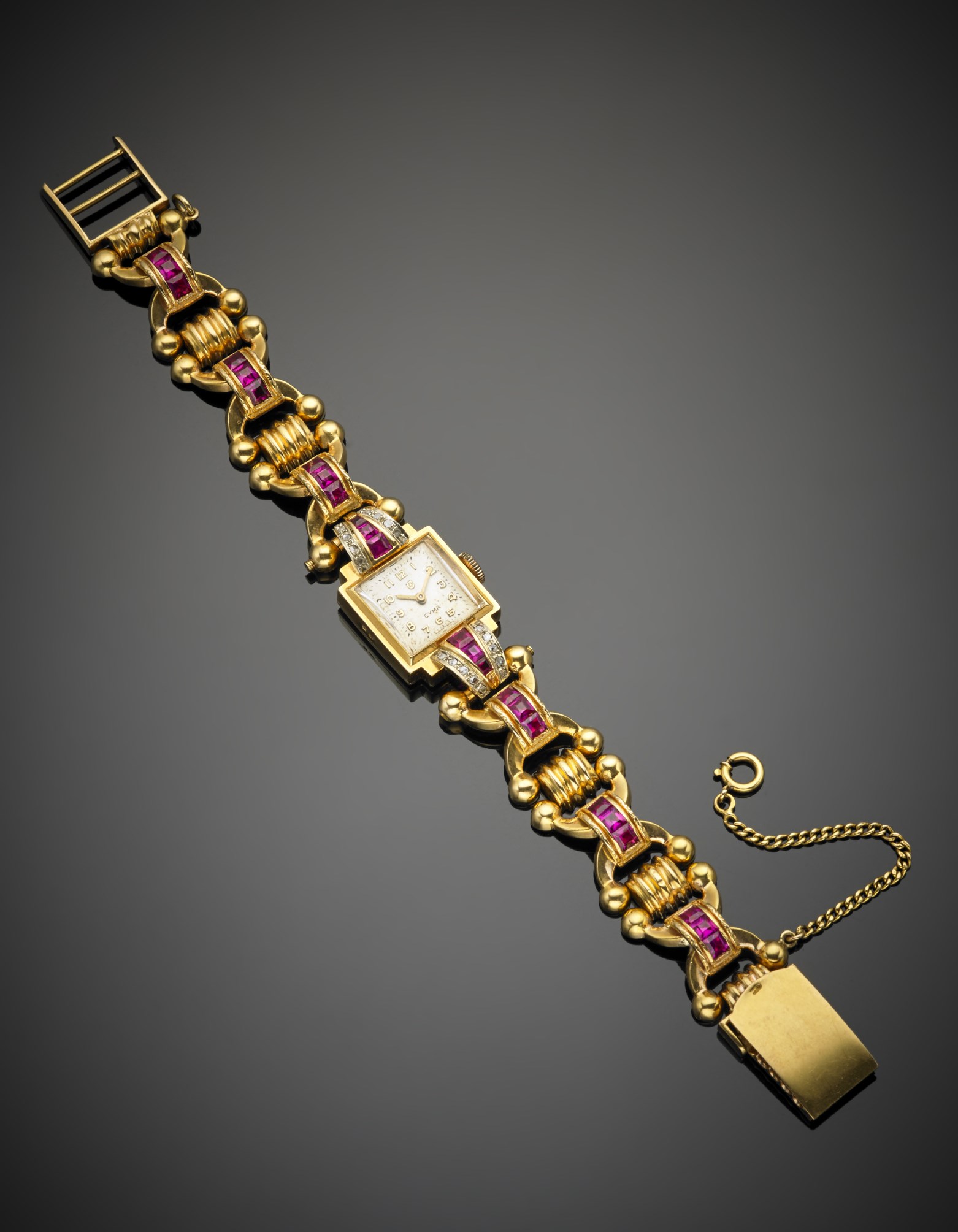 CYMA Orologio da polso da donna oro con diamanti e rubini sintetici, quadrante argentato e firmato, movimento con carica manuale, g. 43,20, lungh. cm 17,5 regolabile CYMA Lady's yellow gold diamond and synthetic ruby wristwatch, silvered signed dial, manual wind movement, adjustable