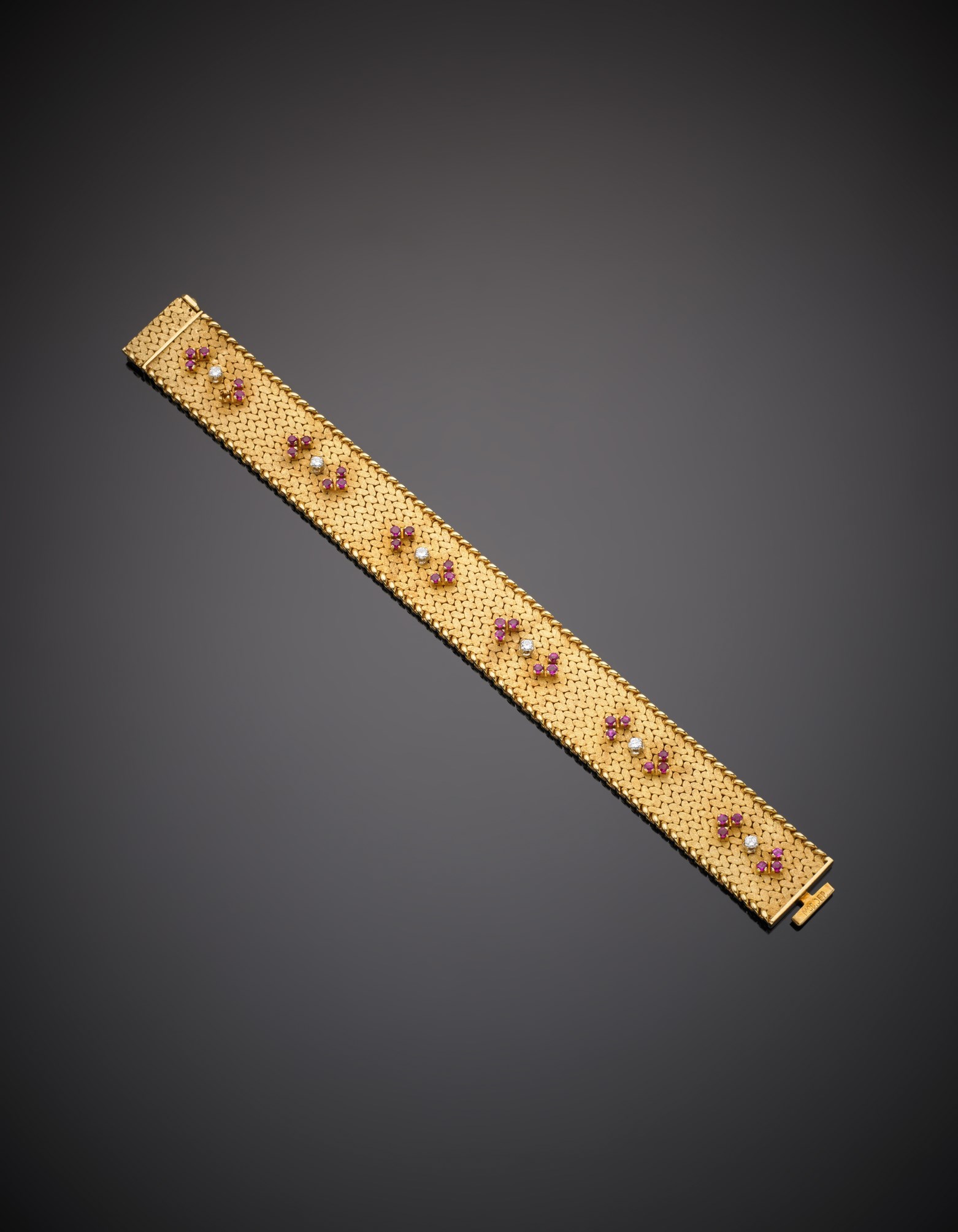 Bracciale in oro giallo lucido e satinato con rubini rotondi e diamanti g. 77,30, lungh. cm 18,50, h cm 1,90. Punzonato 2 BO A diamond and ruby gold bracelet. Marked