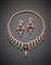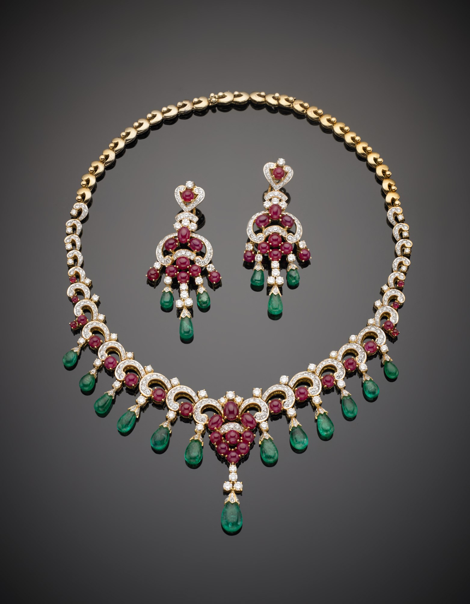 Demi-parure, collier ed orecchini pendenti in oro giallo, con diamanti rotondi taglio a brillante, rubini cabochon e smeraldi a goccia, g. 115,40, misure: collier cm 42 circa, orecchini cm 6,50 Yellow gold suite comprising a necklace and earrings set with diamonds, cabochon rubies and emerald drops