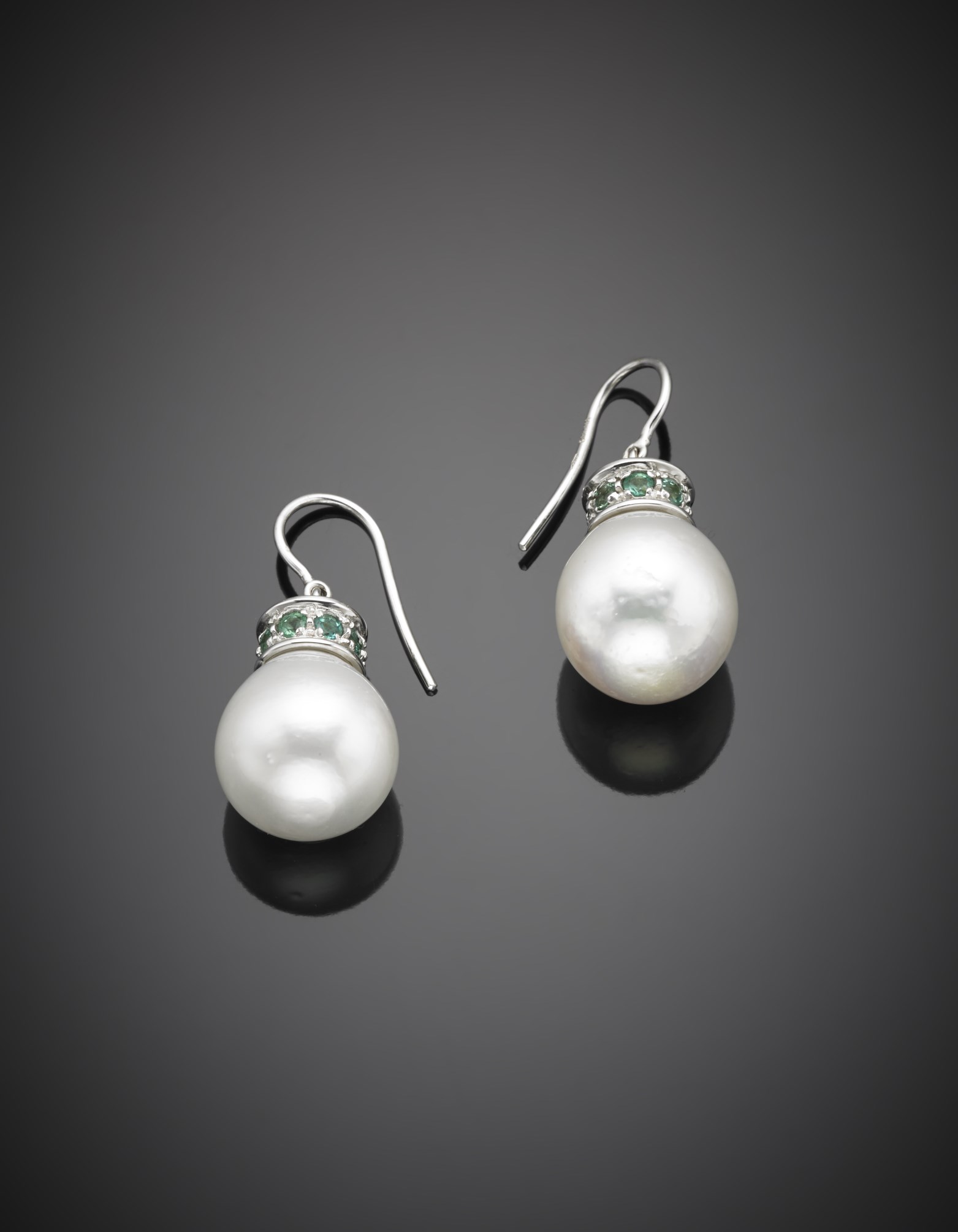 Orecchini in oro bianco a monachella con perle south sea bianche di mm 14,25 circa e smeraldi a rifinirla g. 14,30 South Sea pearl and emerald white gold earrings