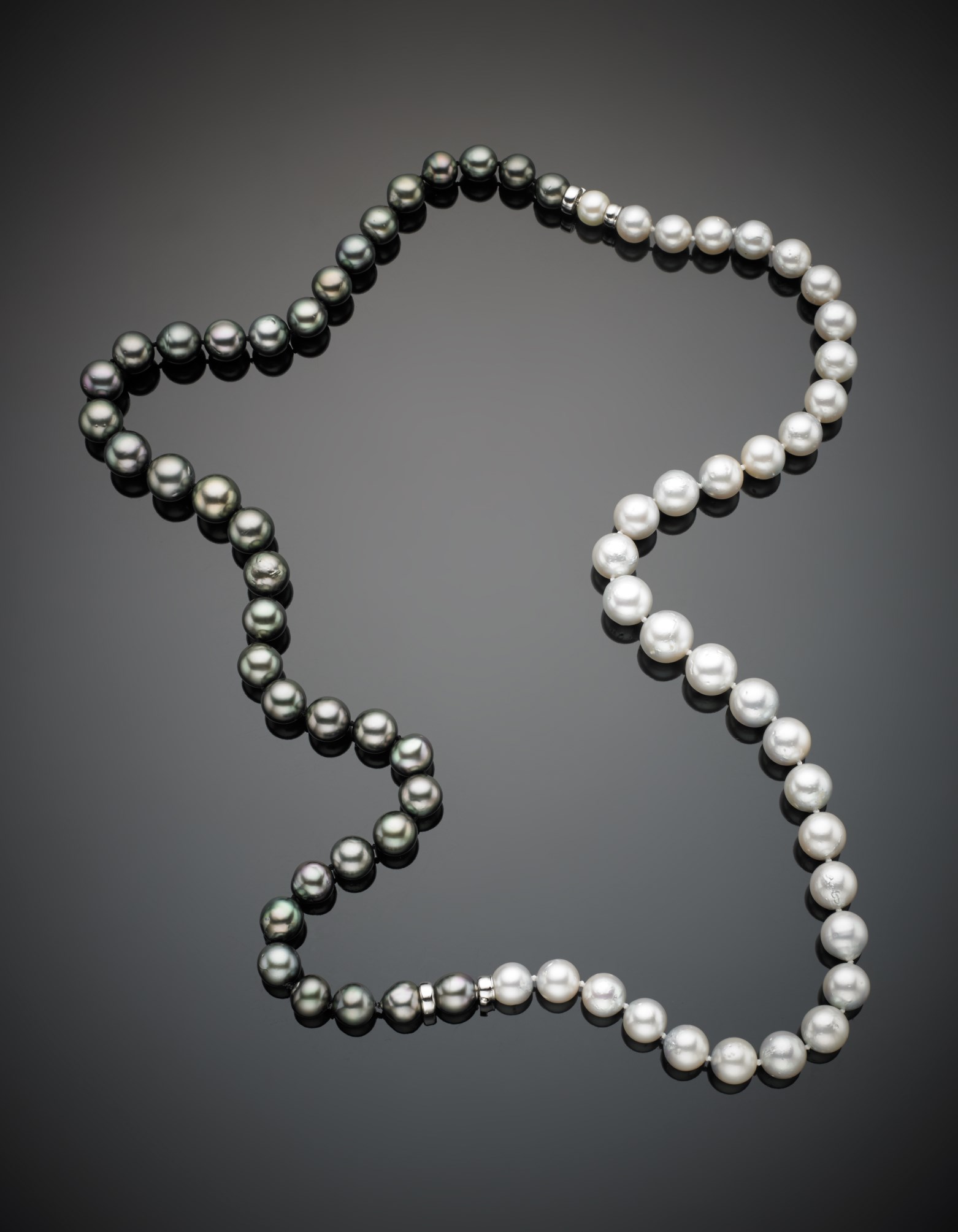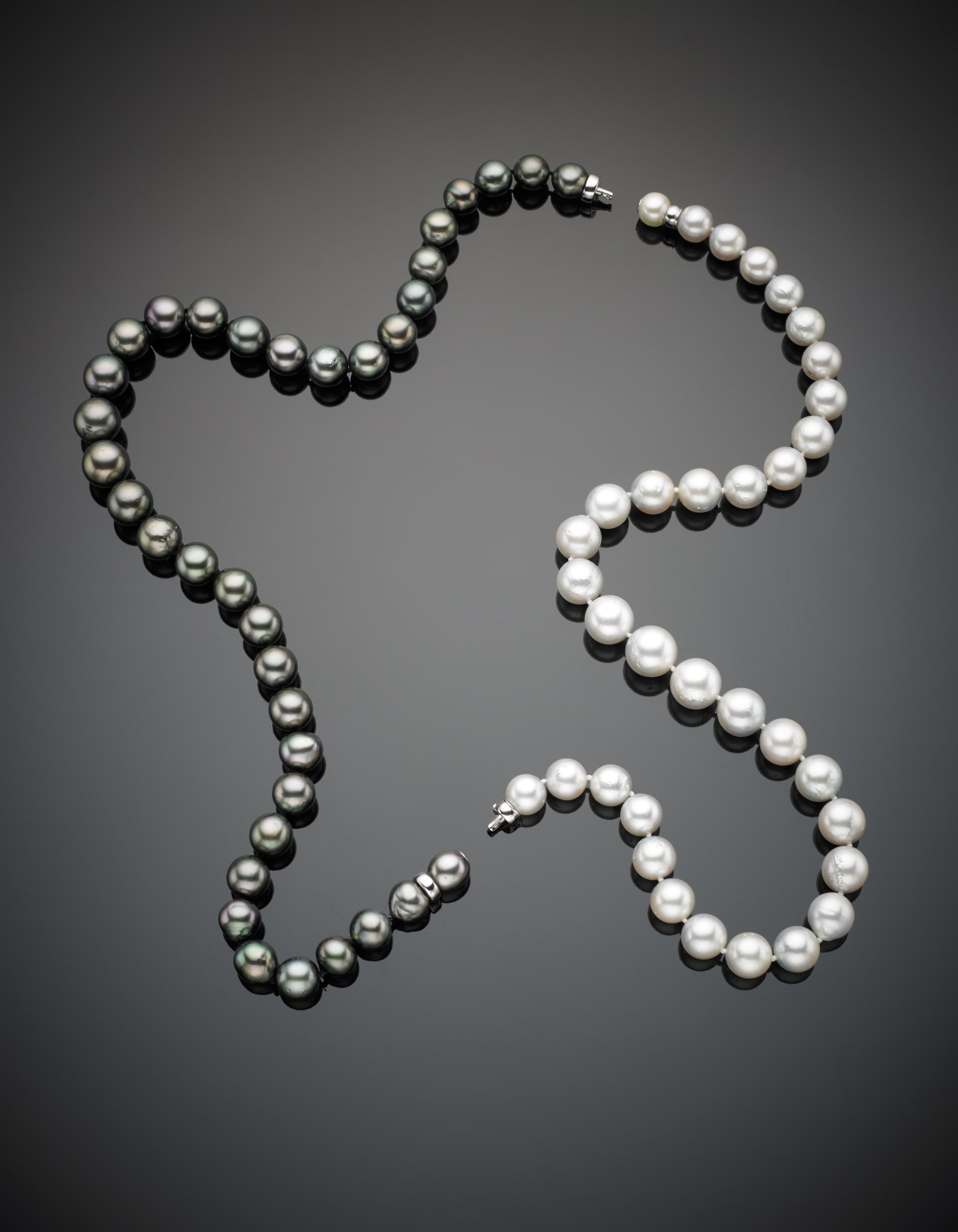 Lotto di due collane di perle South Sea bianche e nere unibili, le prime da...