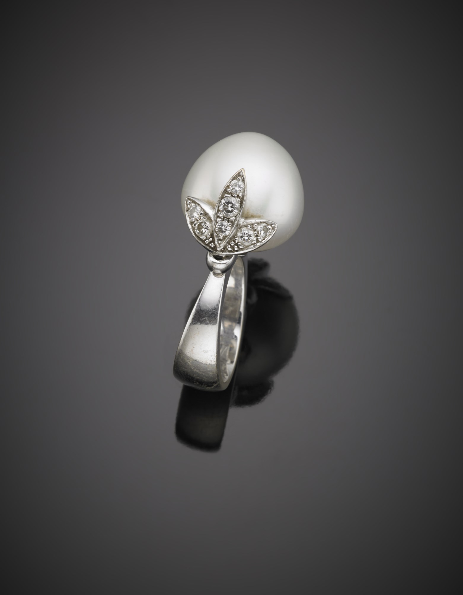 Anello in oro bianco con diamanti rotondi taglio a brillante a tenere una perla South sea bianca di mm 18 circa e alta 17,5 circa g. 22,20 misura 18/58 A white gold and diamond ring centered by a white South sea pearl