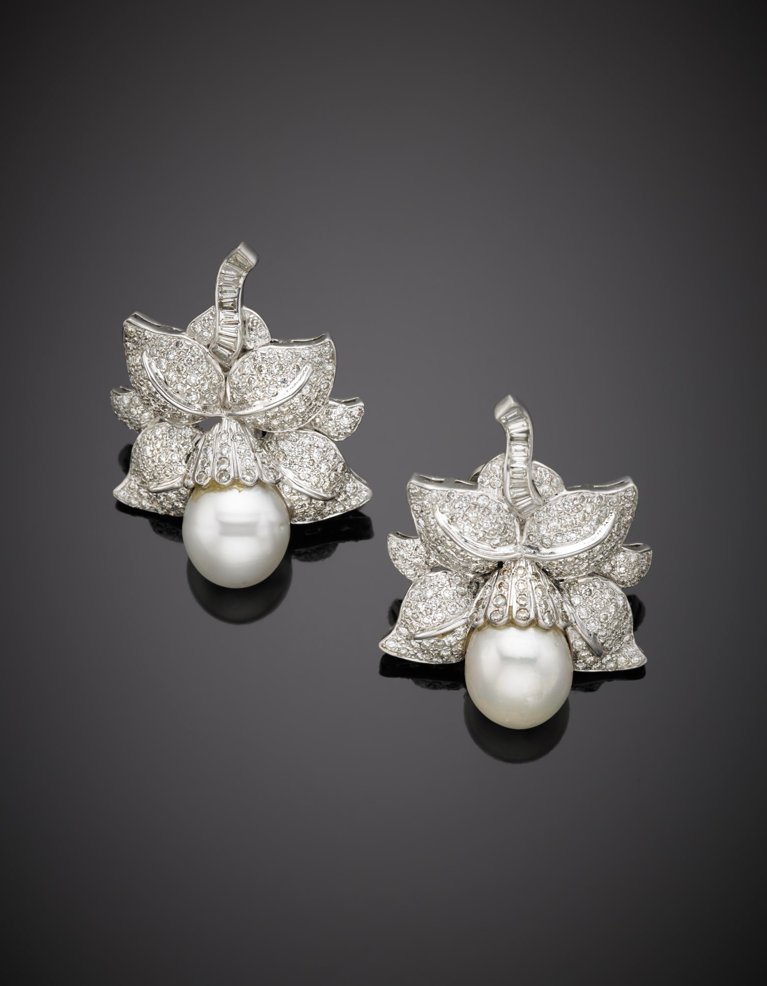 Orecchini a lobo in oro bianco con clips a guisa di foglie con perle South sea di mm 12,50-13,50 circa, diamanti rotondi e baguette, g.37,30 lungh. cm 4,10 South sea pearl and diamond white gold earrings