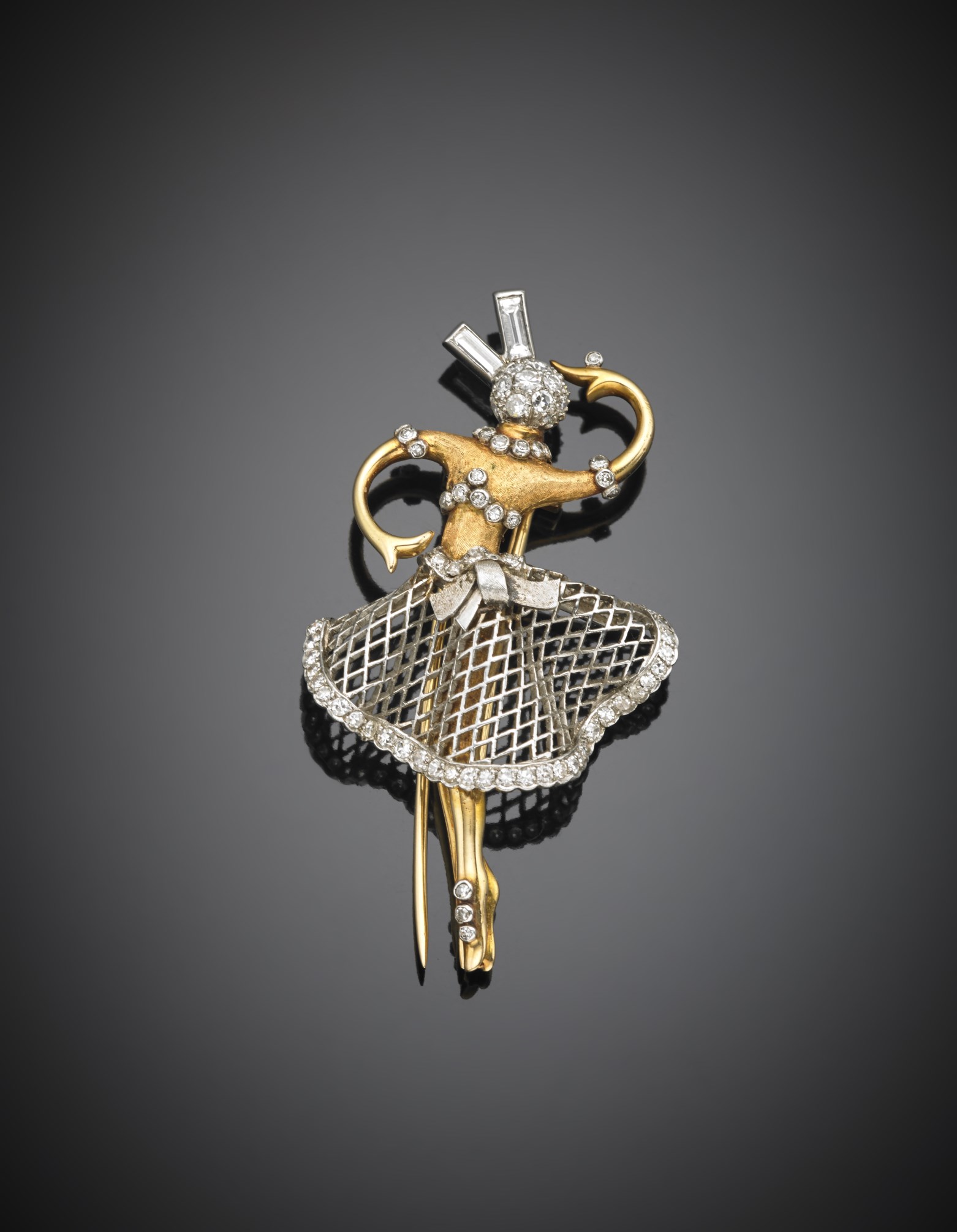 Spilla ballerina in oro giallo e bianco lucido e zigrinato con diamanti rotondi e baguette g.12,80 lungh. cm 5,5 Bi-coloured gold and diamond dancer brooch