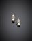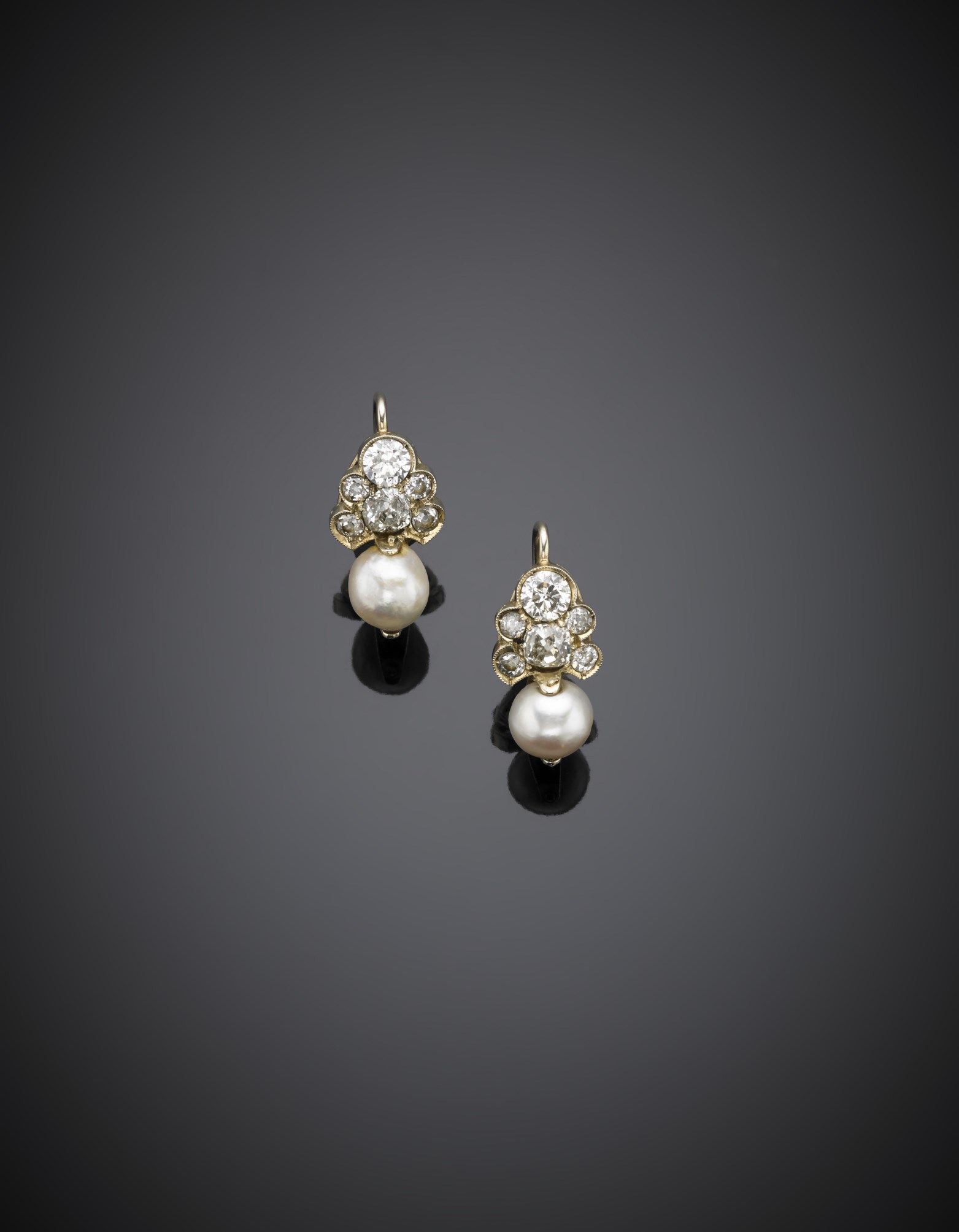 Orecchini pendenti in oro giallo/bianco con diamanti rotondi e cuscino taglio vacchio europeo terminati da due perle bianche g. 5,20 Bi-coloured gold diamond and pearl pendant earrings