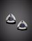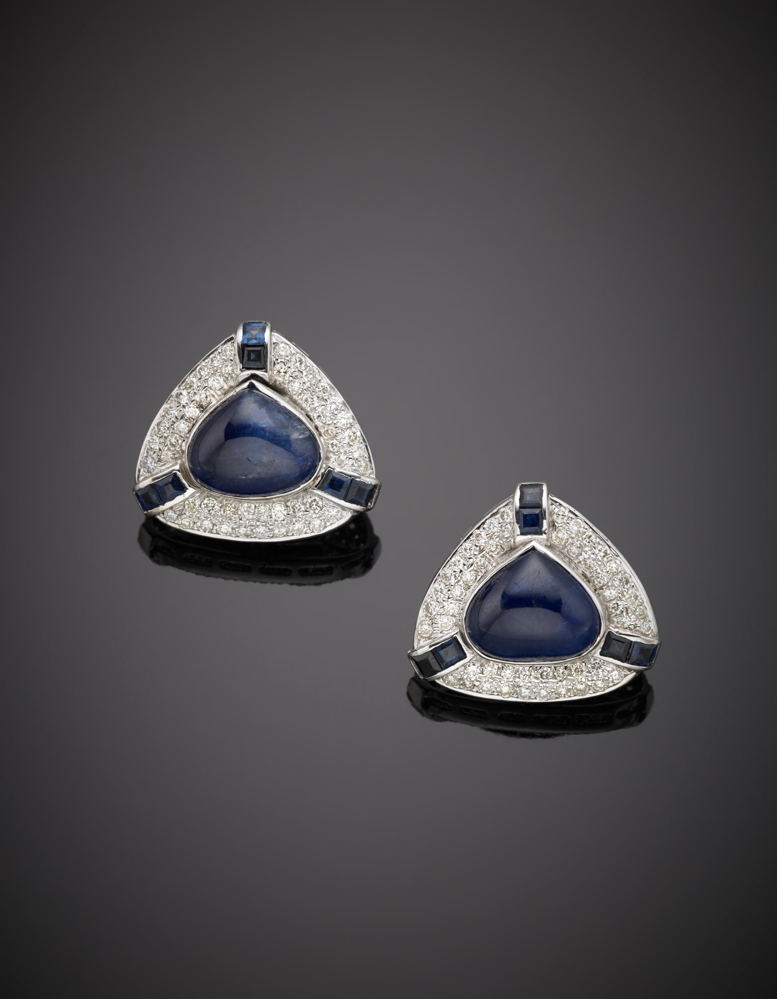Orecchini a lobo con perno e clips in oro bianco con zaffiri cabochon a forma goccia, pavè di diamanti e zaffiri carrè, g.21,50 (difetti) Sapphire and diamond white gold earrings