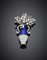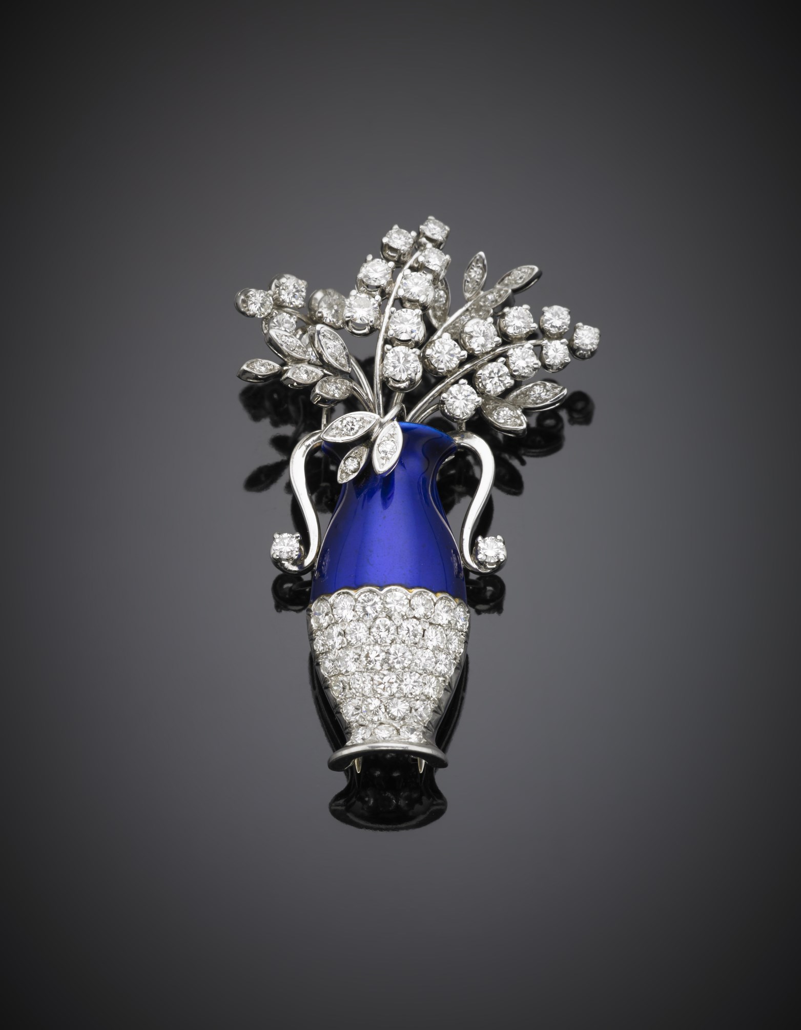 MISSIAGLIA Broche in oro bianco e giallo a forma di vaso e fiori, rifinita con diamanti e smalto blu, g. 19,10, h cm 5 circa MISSIAGLIA Bi-coloured gold flower brooch with diamonds and blue enamel