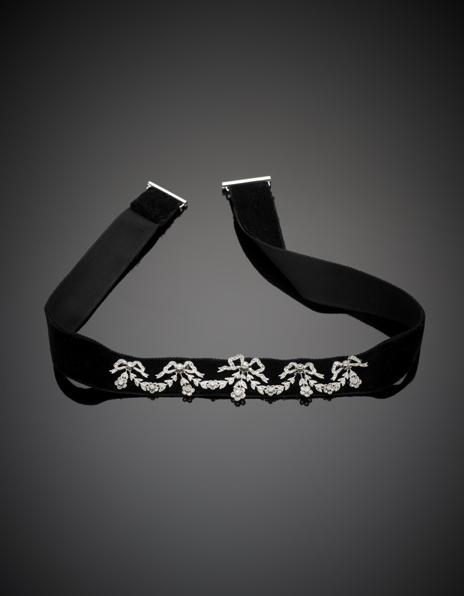 Collier de chien in velluto nero con ghirlande in platino e diamanti a guisa di fiori e fiocchi, complessivi g.14,40 lungh. cm 37,7 Diamond and platinum wreaths on a black velvet collier de chien