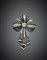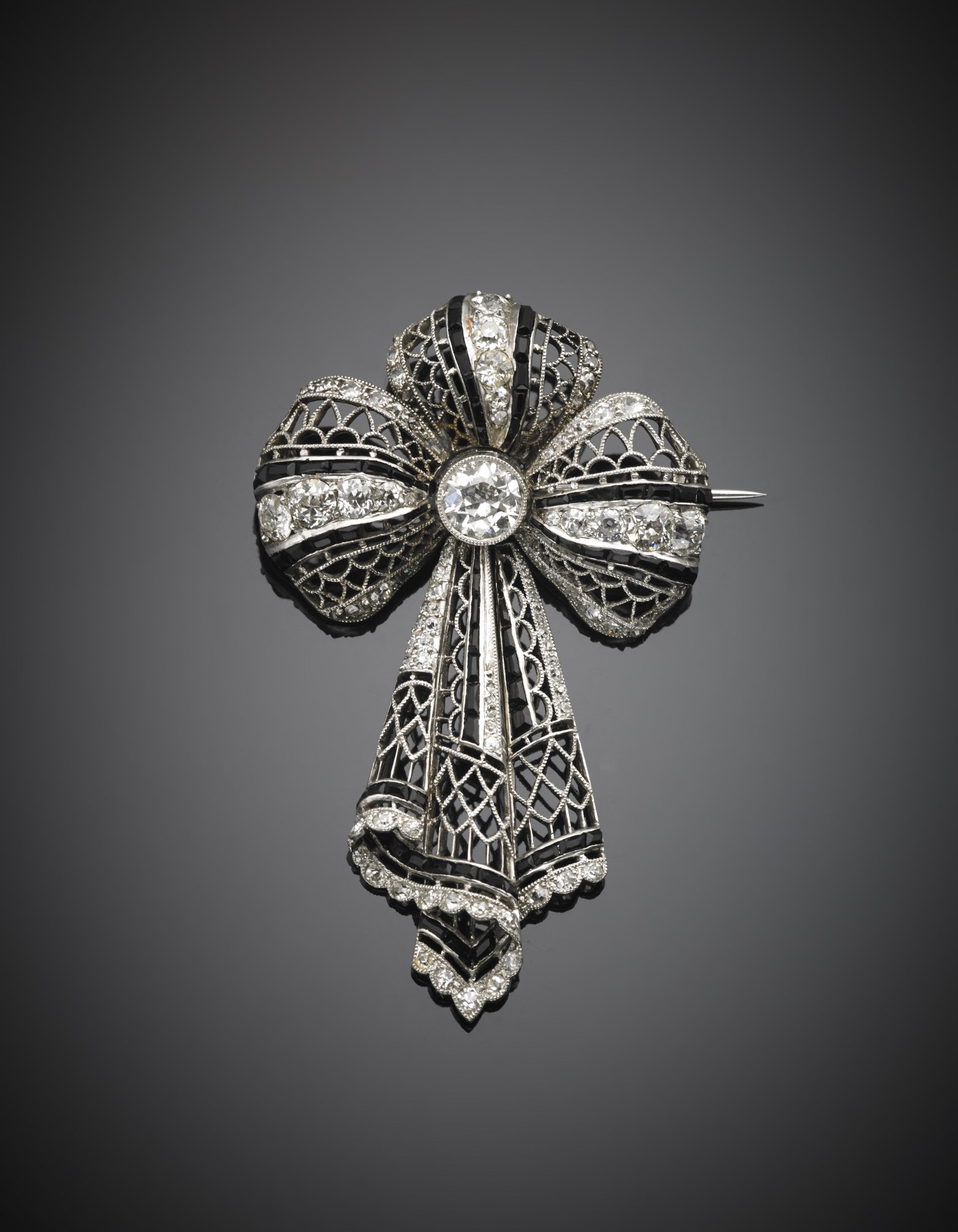 Spilla a fiocco snodata e traforata in oro bianco diamanti e gemme calibrè...