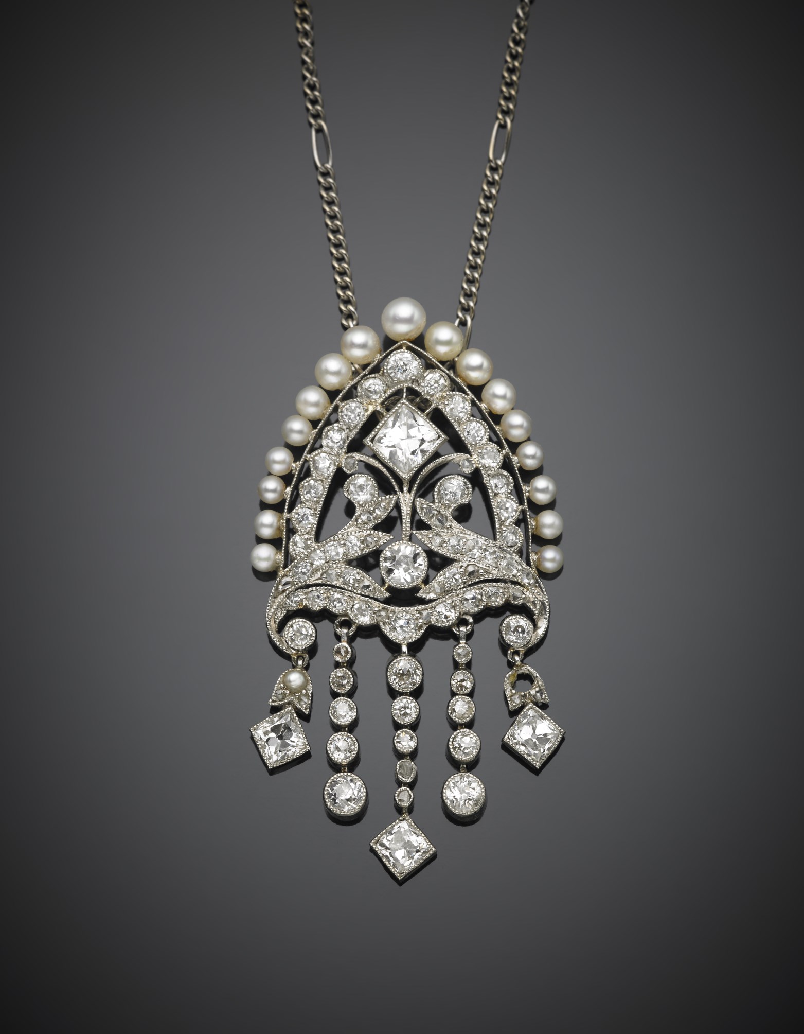 Catenina in oro bianco con pendente in platino, diamanti rotondi e quadrati con taglio fantasia antico e piccole perle scalate, g.10,30. Punzone 2437 (una mezza perla mancante)