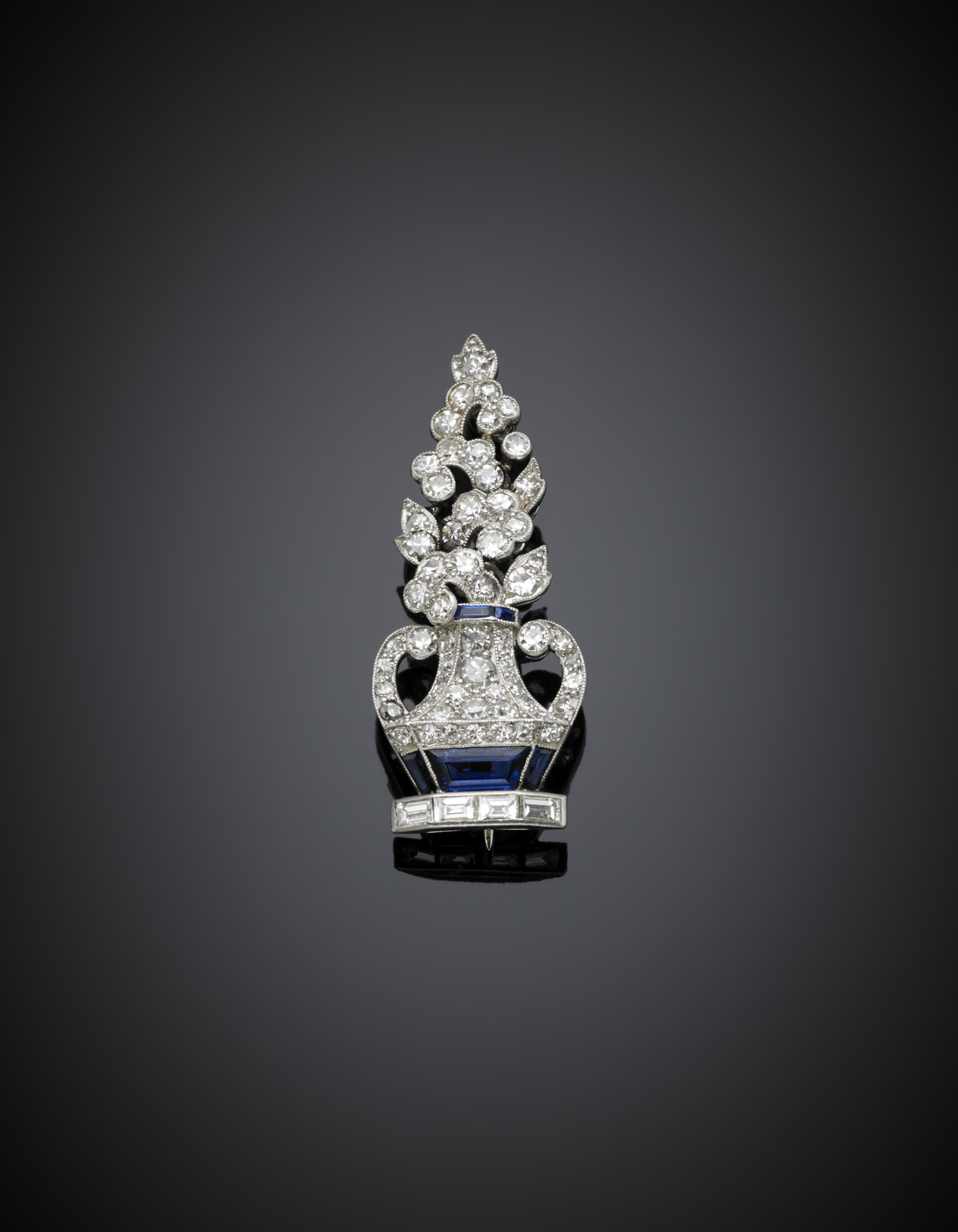 Broche in platino a vaso di fiori con zaffiri e diamanti g. 6,20 lungh. cm...